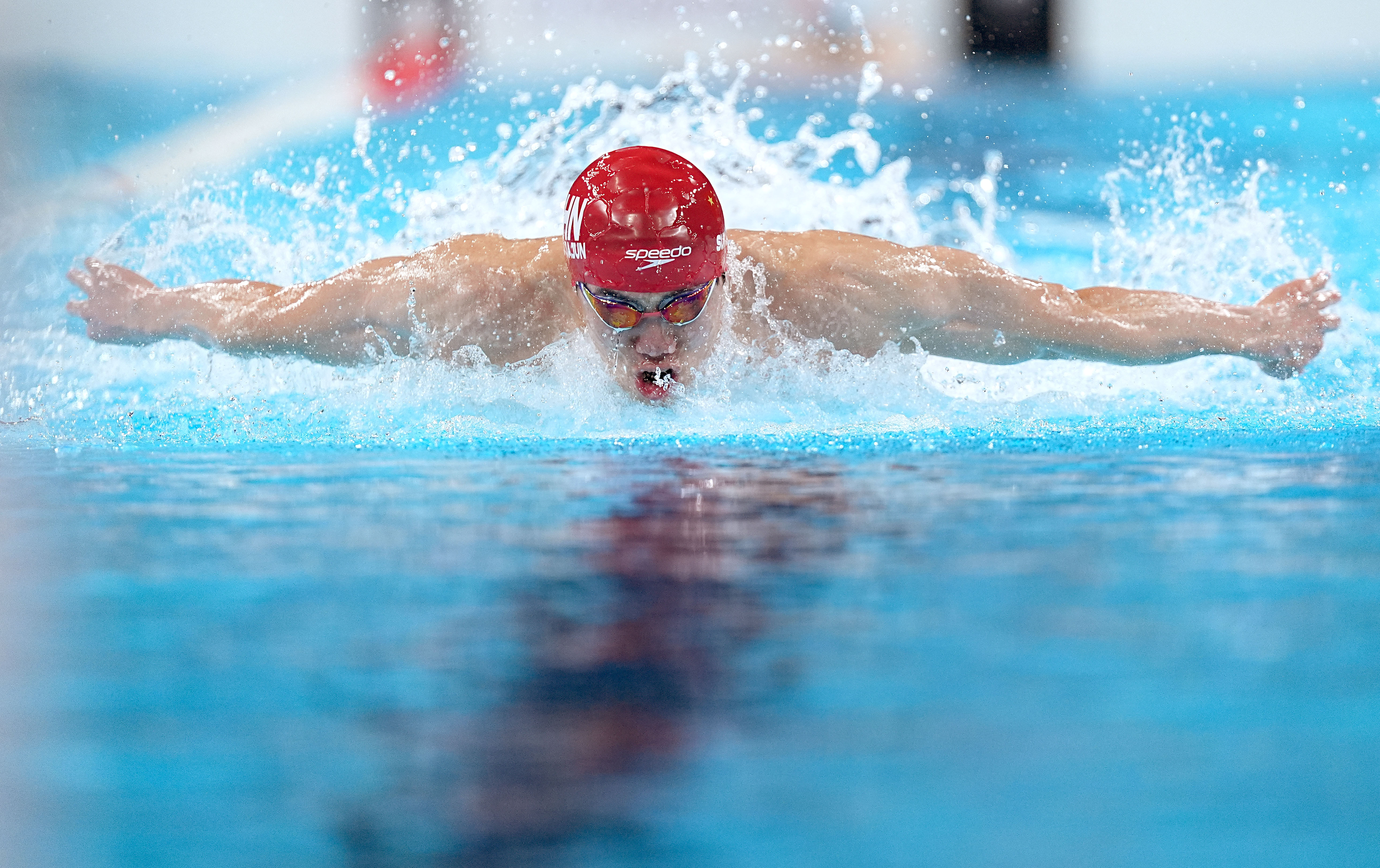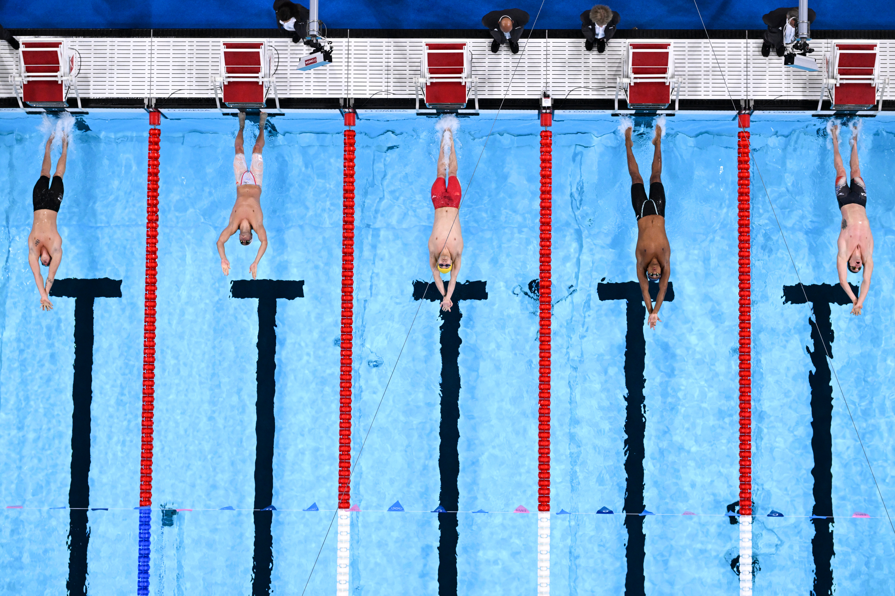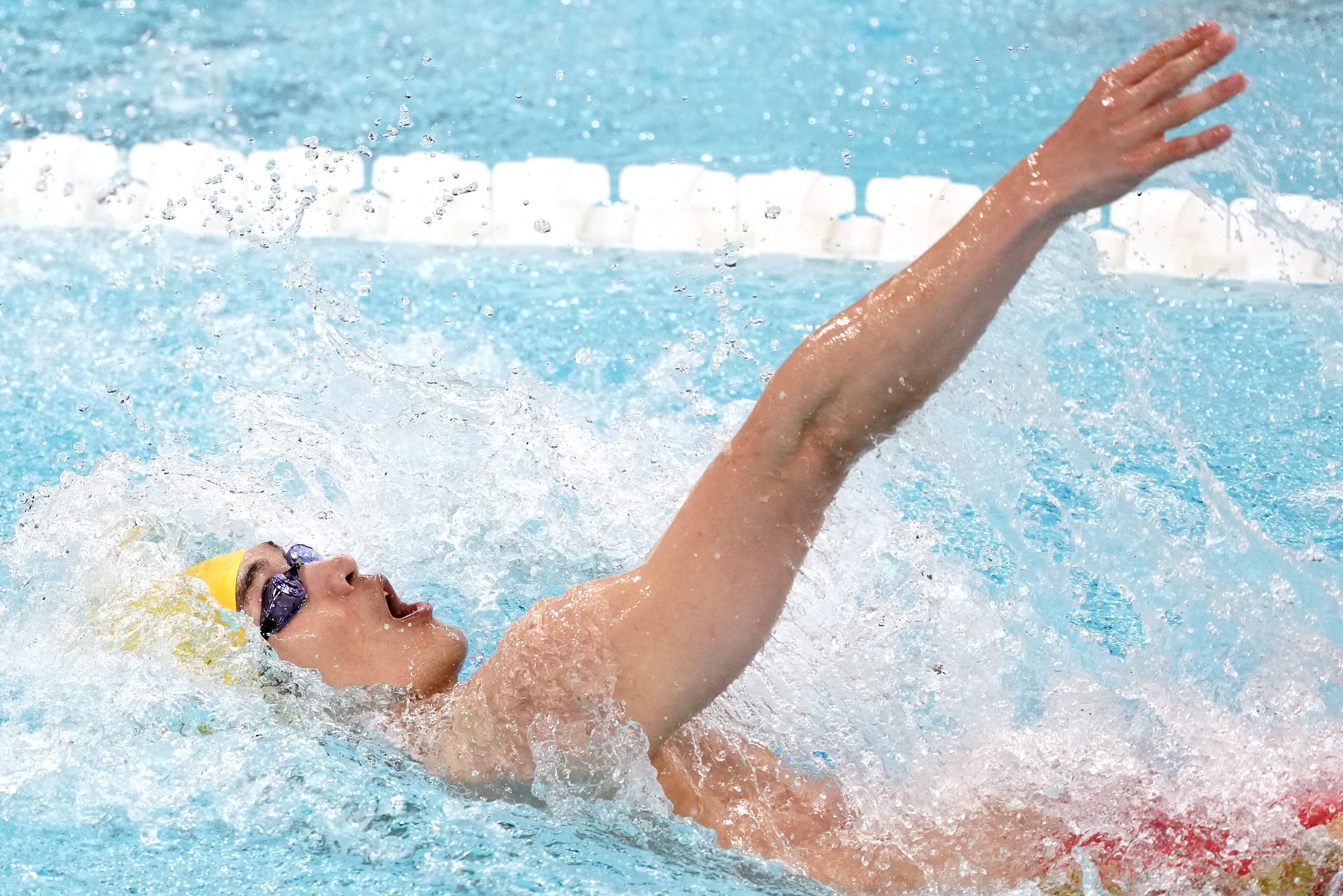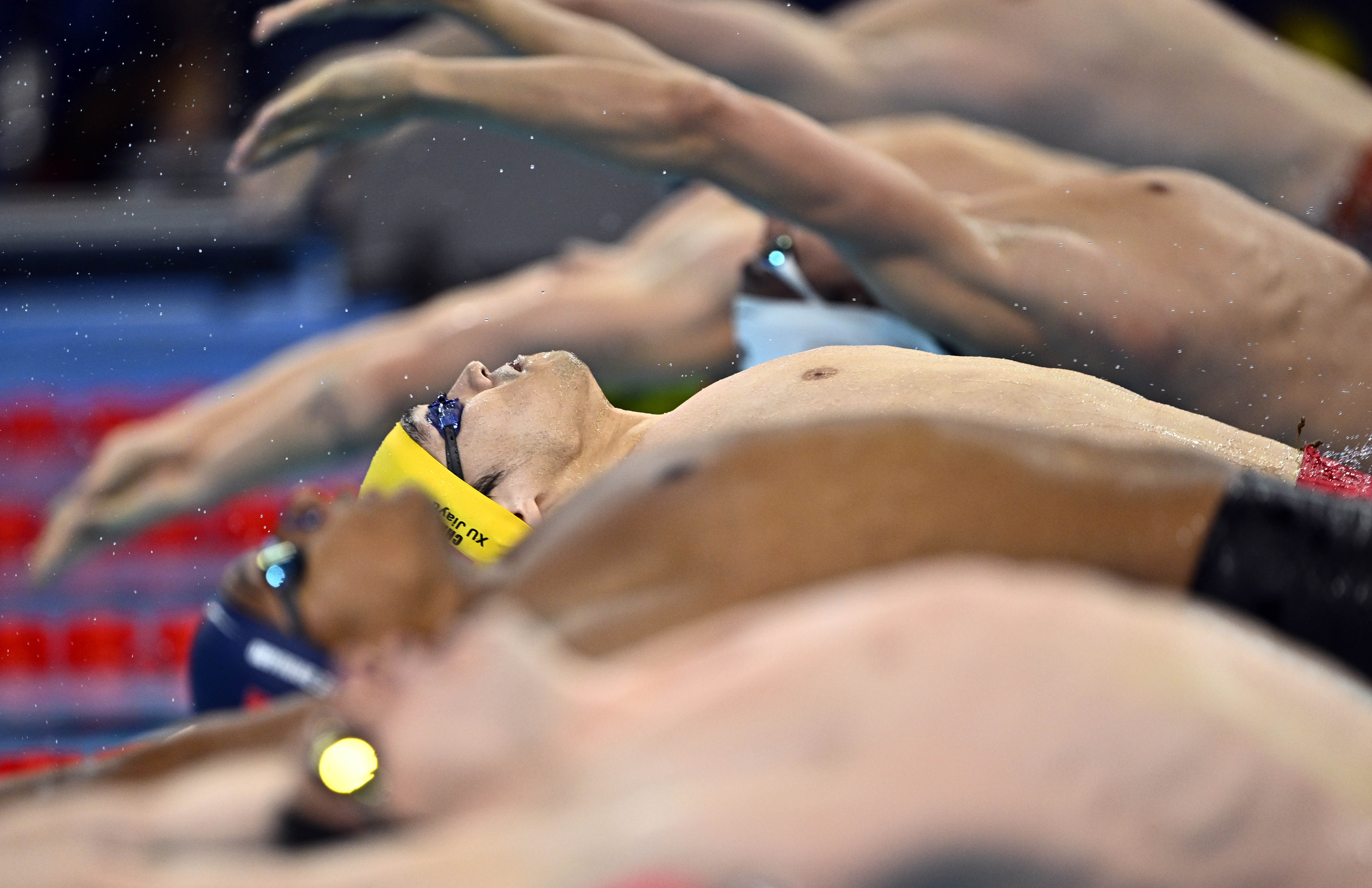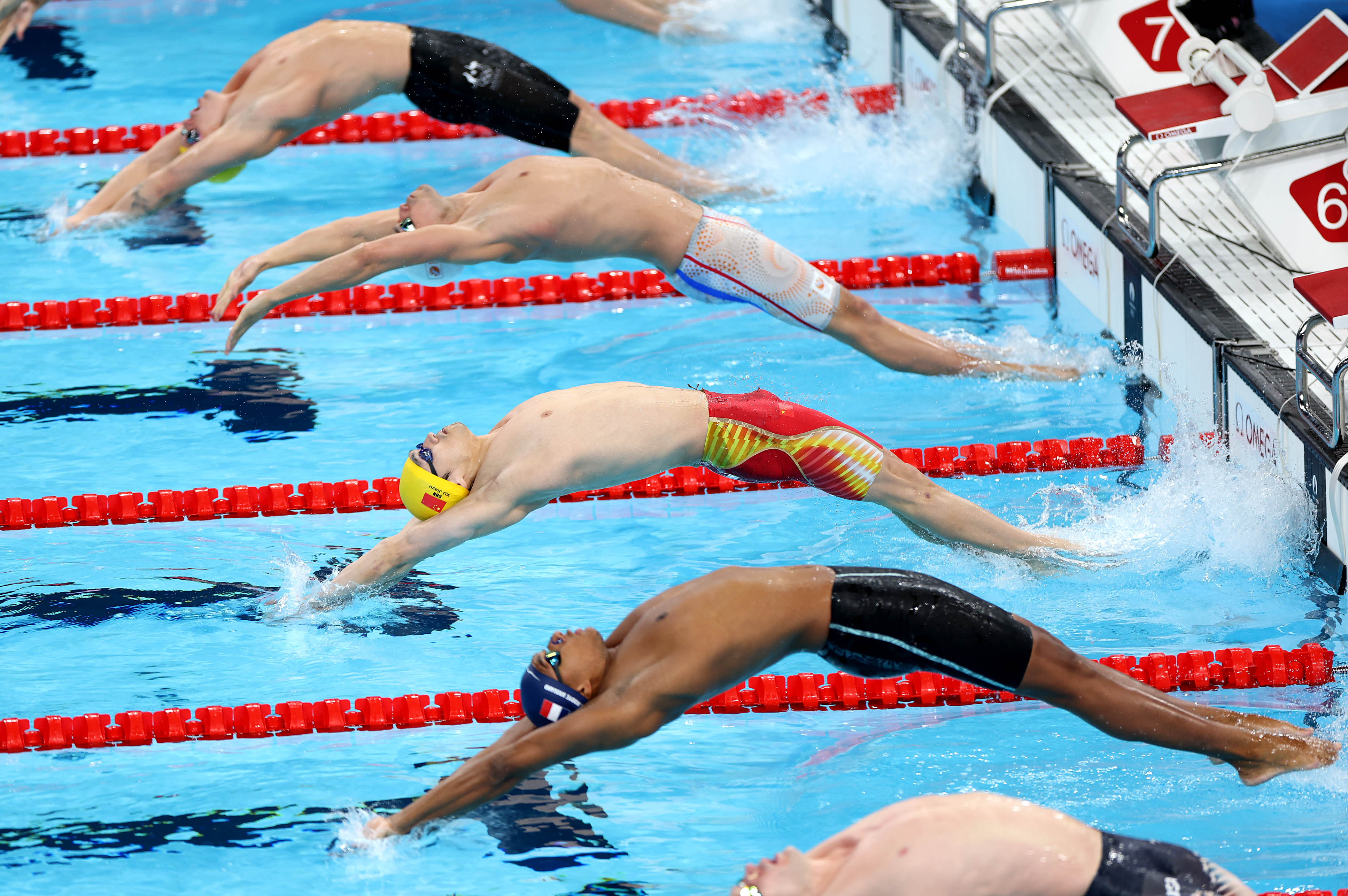 ↑中国队选手徐嘉余(中)在比赛中入水。新华社记者 黄宗治 摄