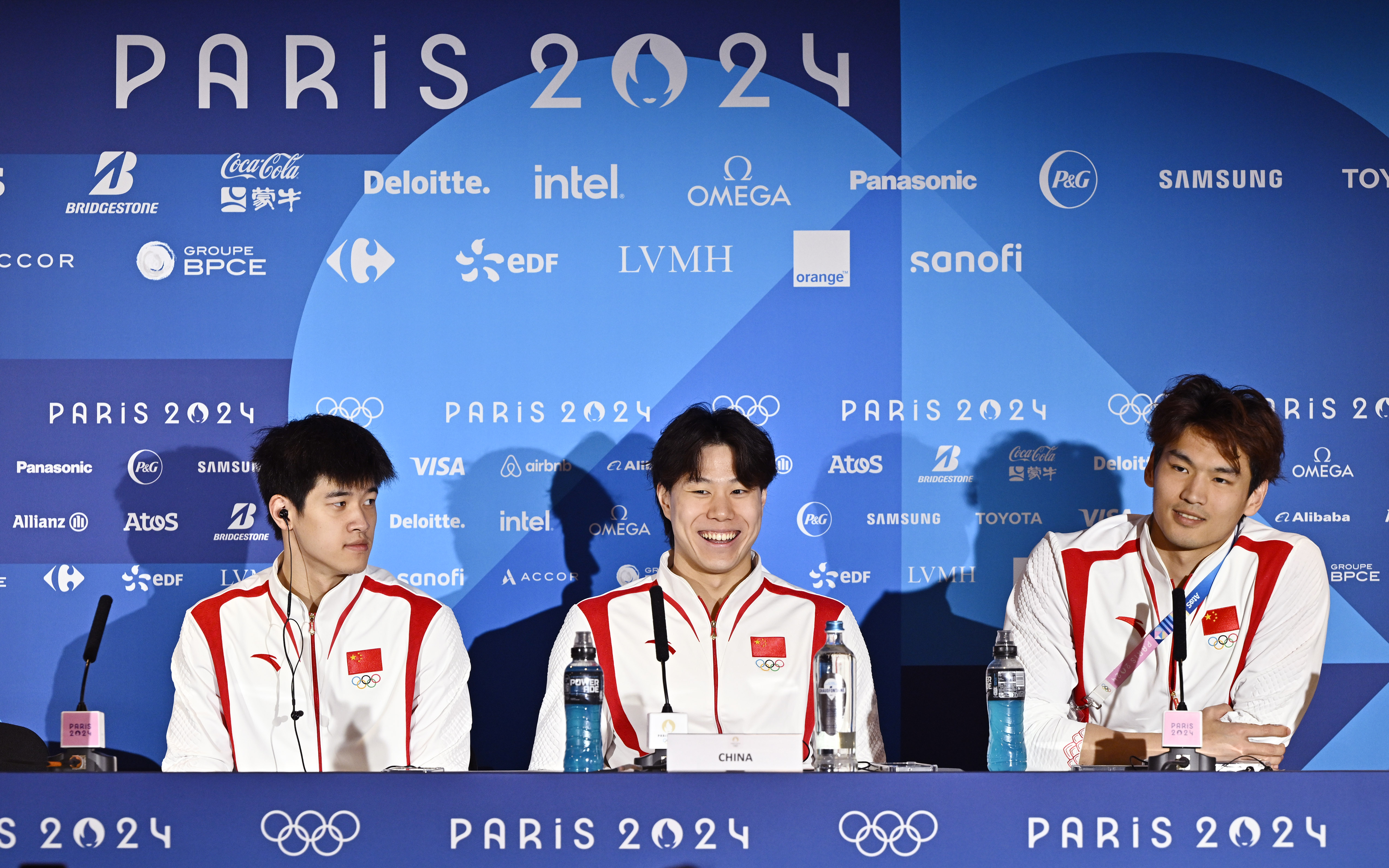 ↑中国队选手潘展乐、覃海洋、徐嘉余(从左至右)在赛后新闻发布会上。新华社记者 王鹏 摄