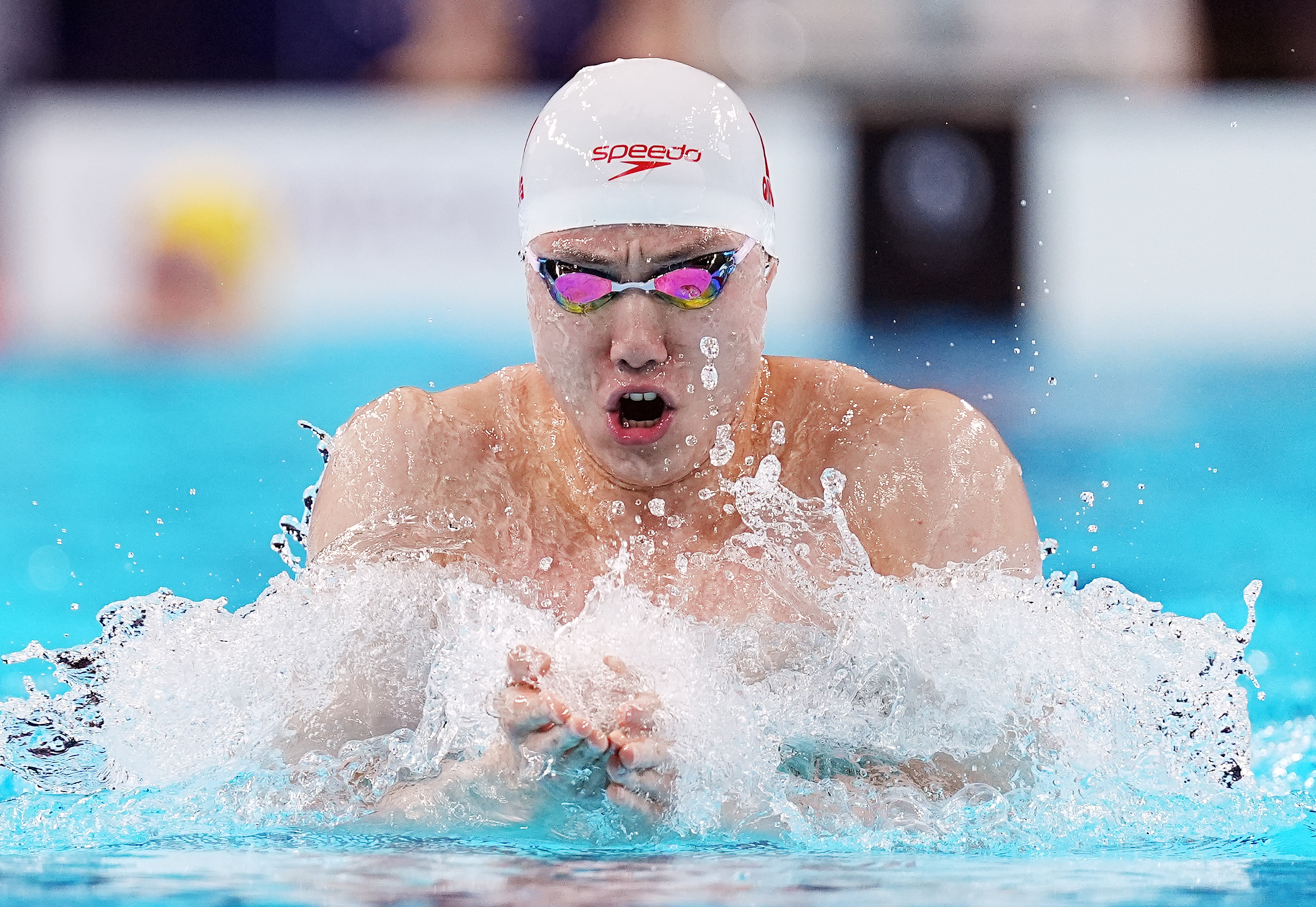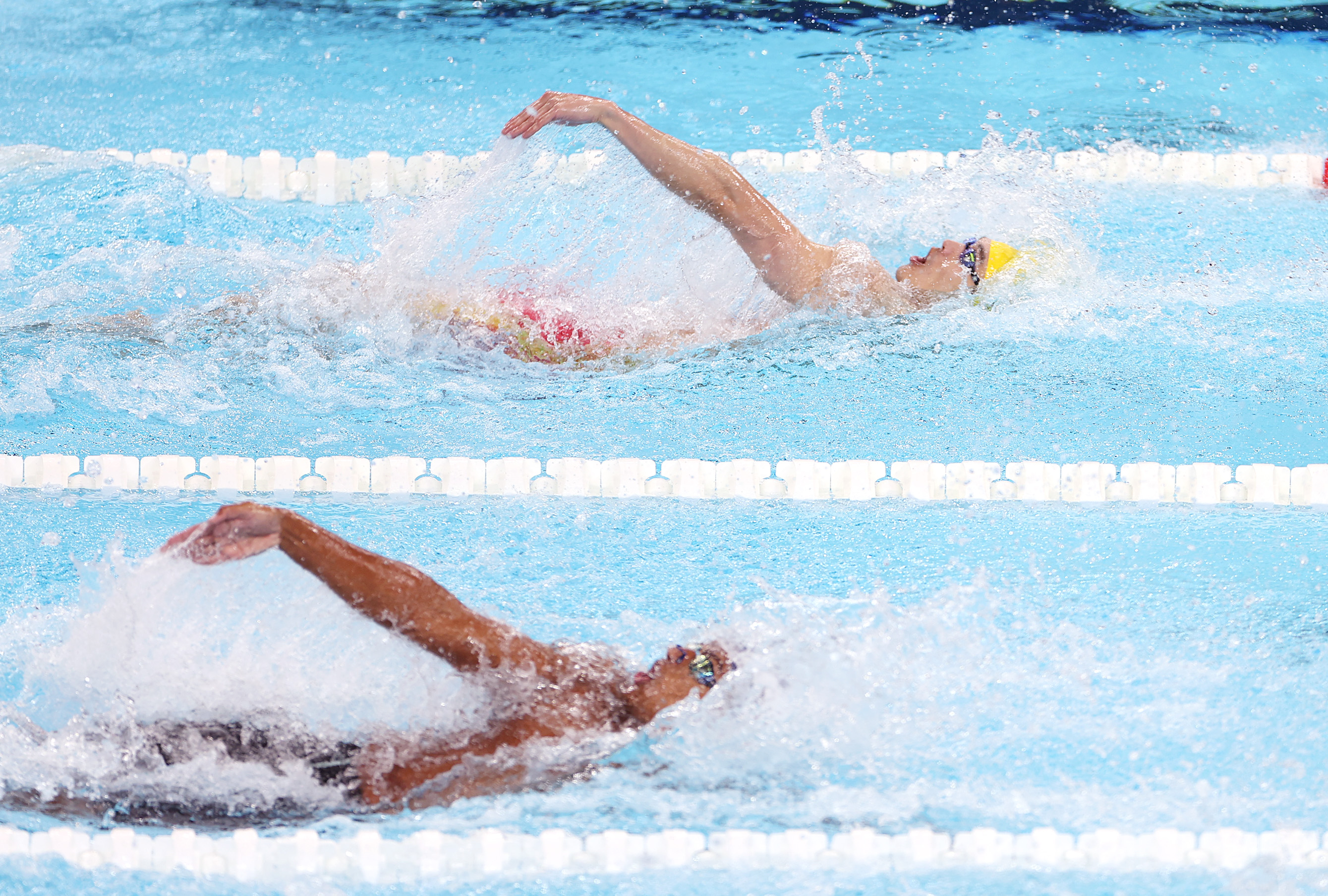 ↑中国队第四棒选手潘展乐(右)在最后阶段冲刺。新华社记者 夏一方 摄