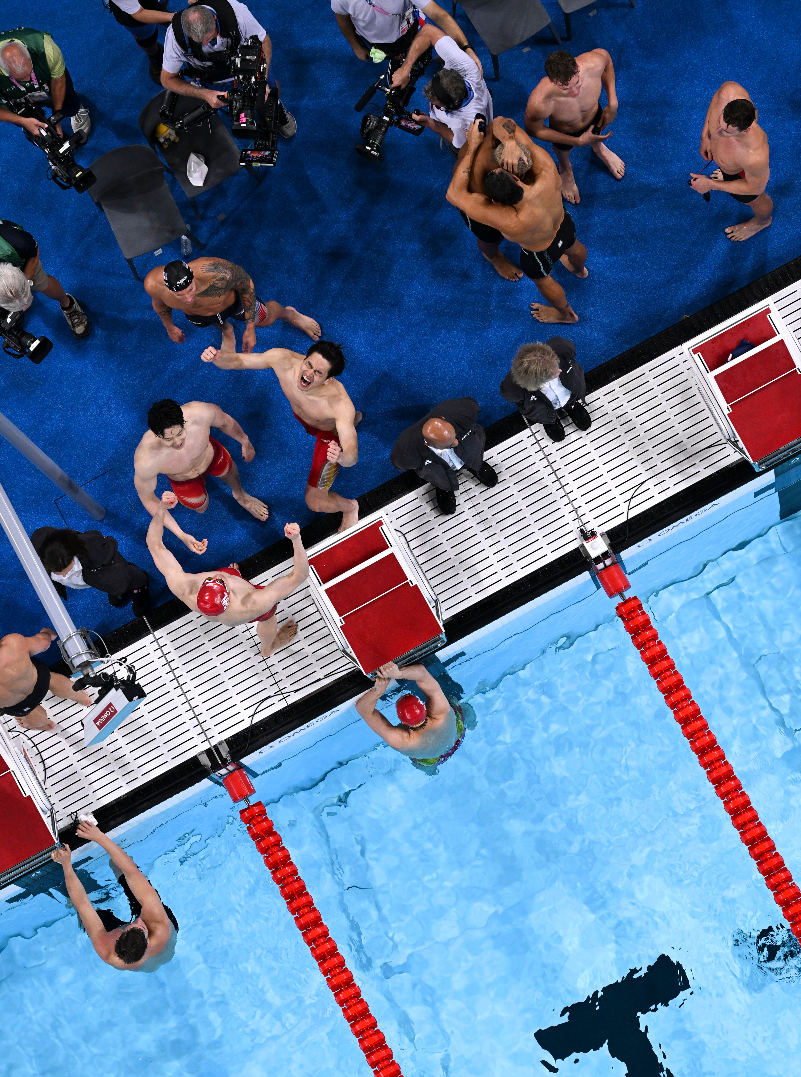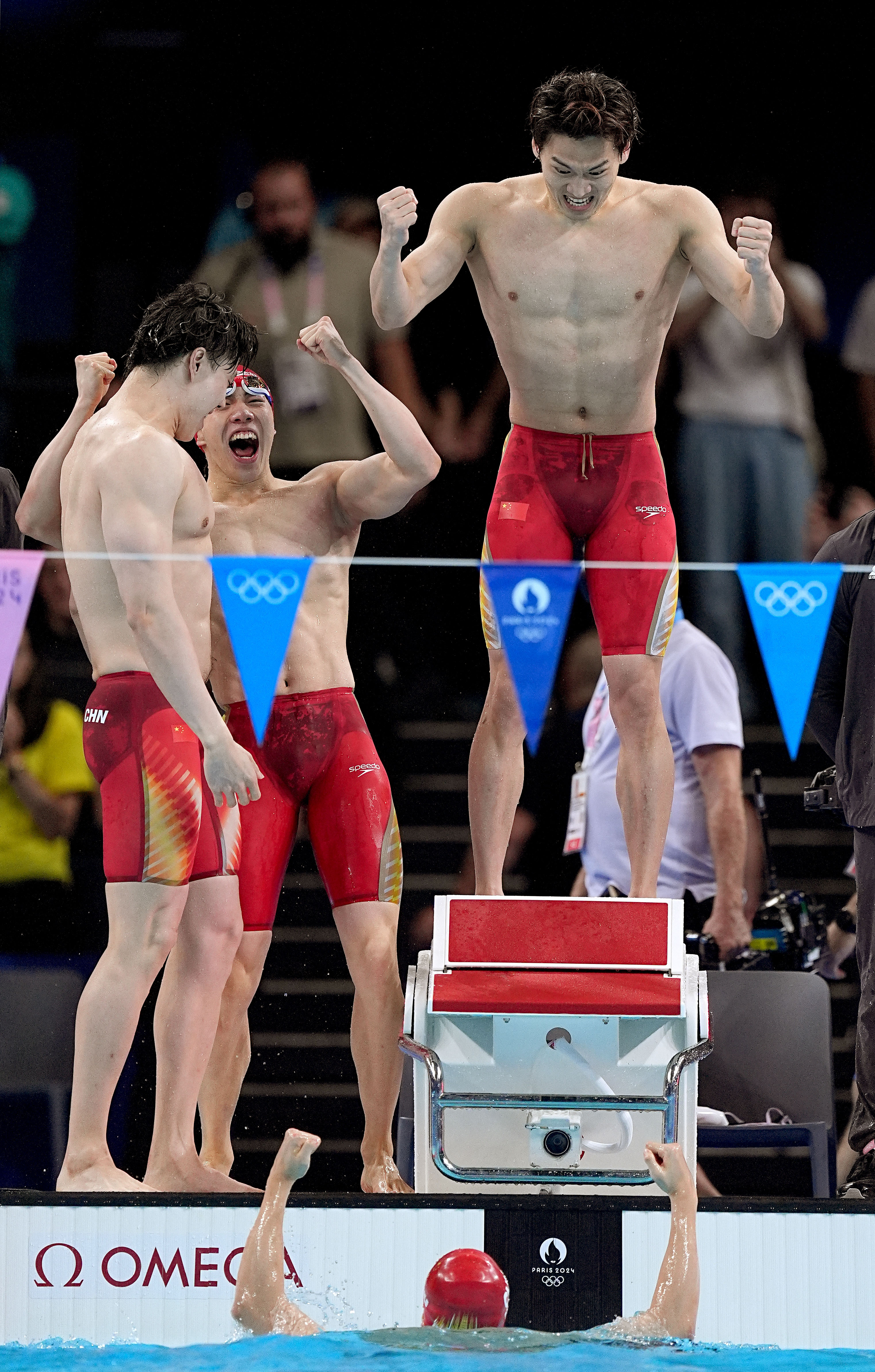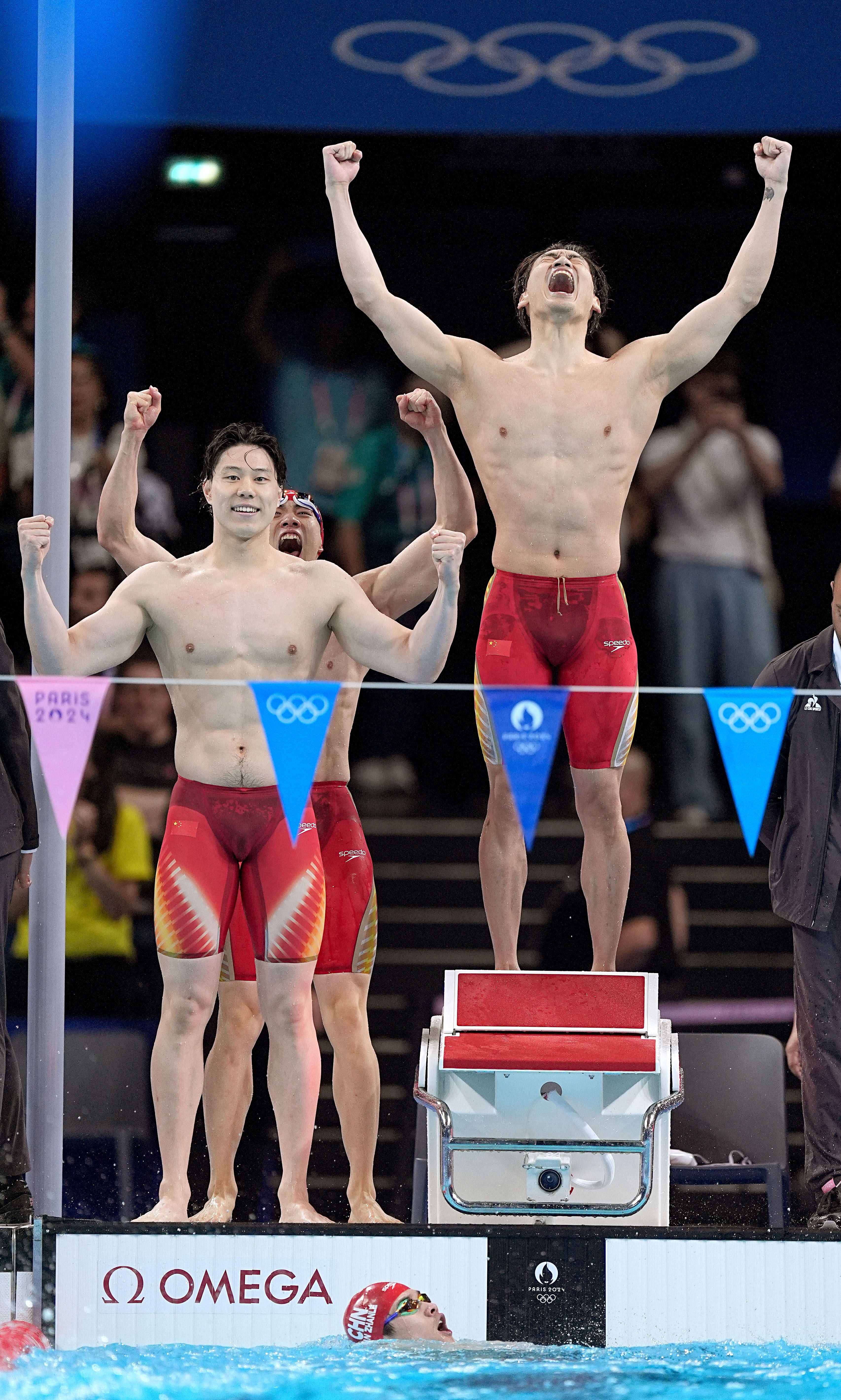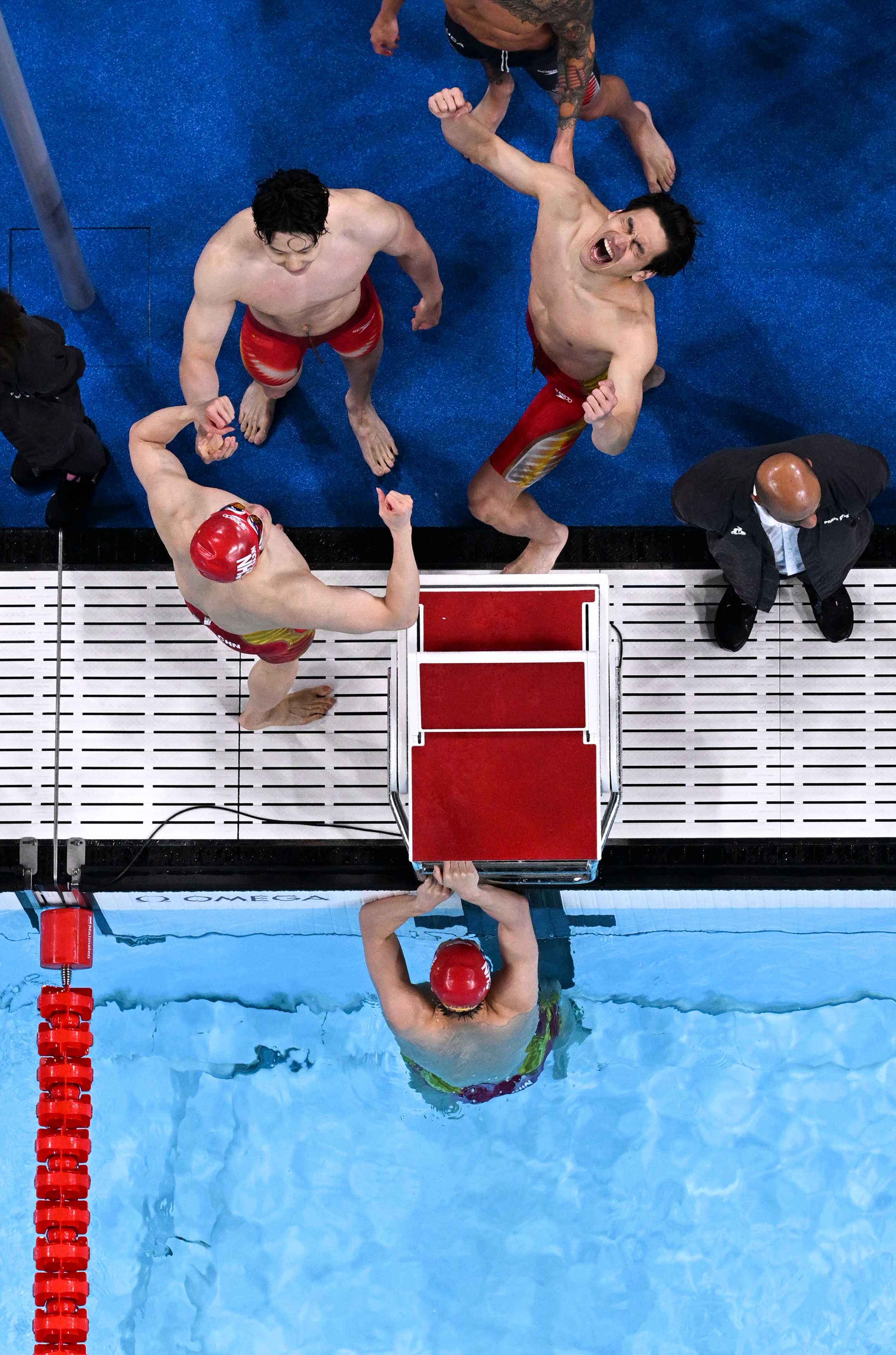 ↑冠军中国队选手徐嘉余(上右)、覃海洋(上左)、孙佳俊(上中)、潘展乐在比赛后庆祝。新华社记者 杜宇 摄