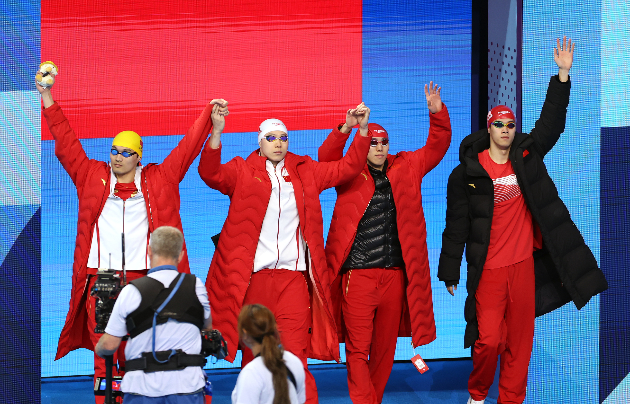 ↑冠军中国队选手徐嘉余、覃海洋、孙佳俊、潘展乐(从左至右)在颁奖仪式上。新华社记者 杜宇 摄