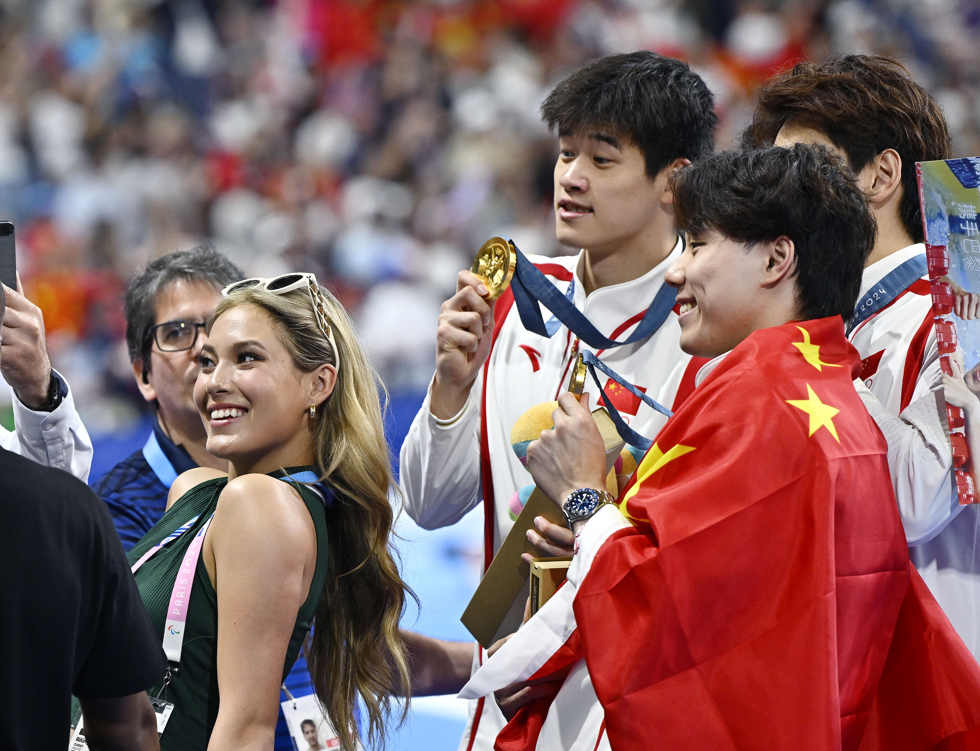 ↑冠军中国队选手孙佳俊、覃海洋、潘展乐、徐嘉余(从左至右)在颁奖仪式后。新华社记者 杜宇 摄