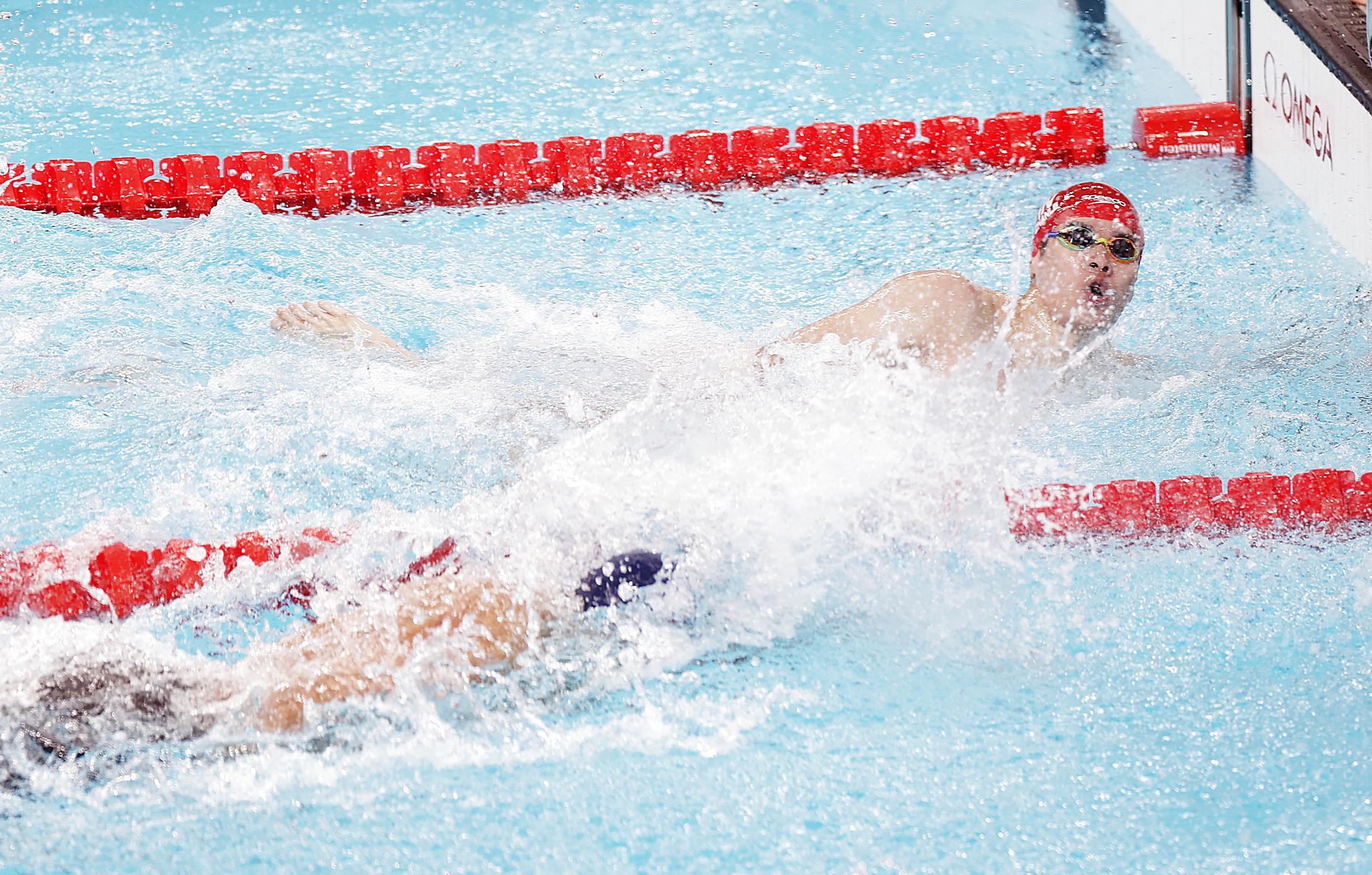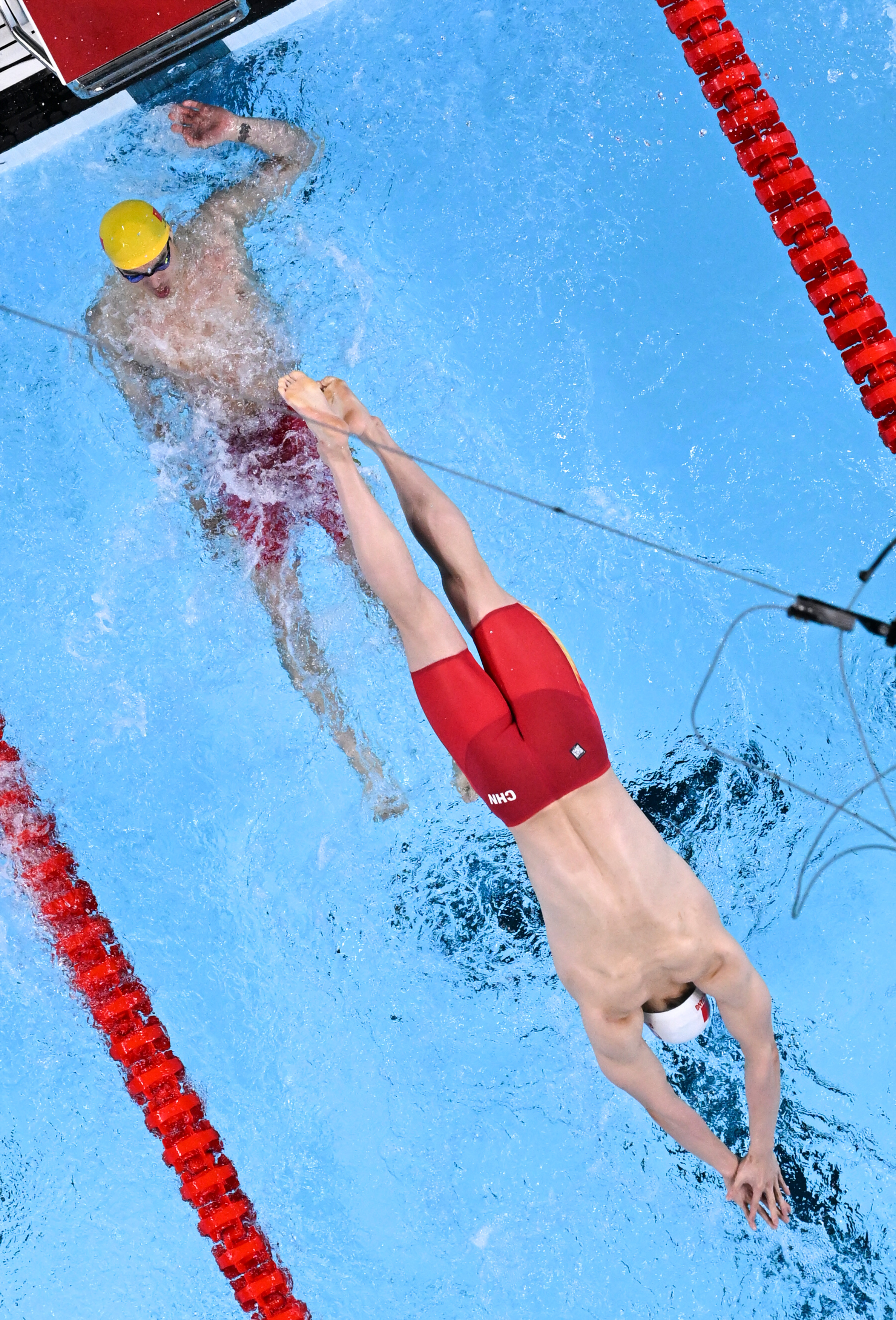 ↑中国队选手潘展乐(右)率先撞线。新华社记者 黄宗治 摄