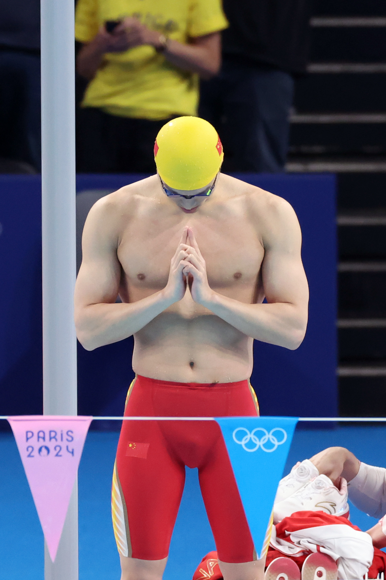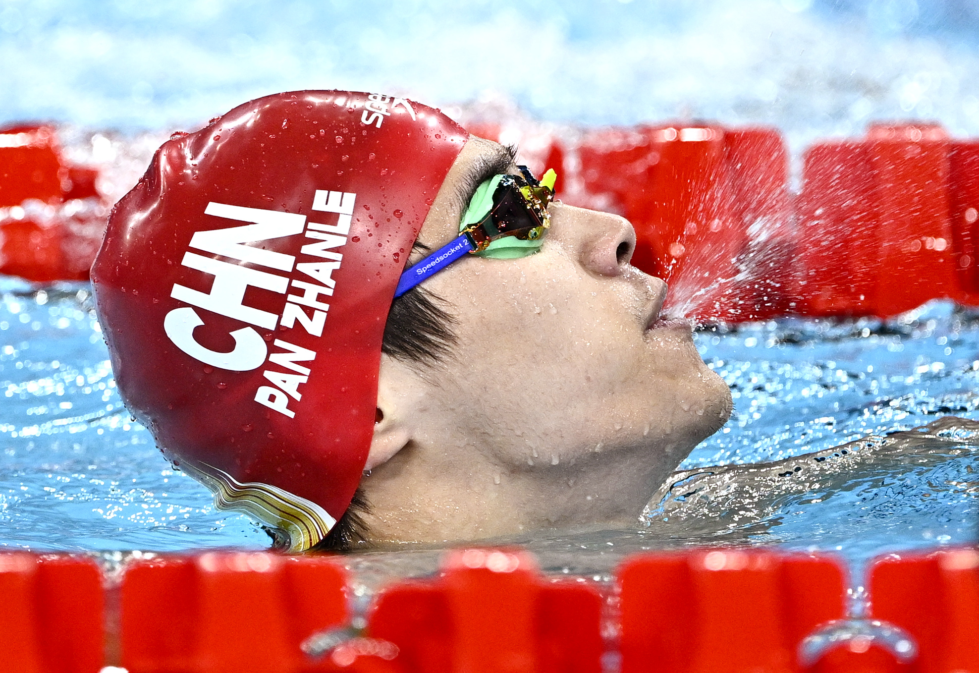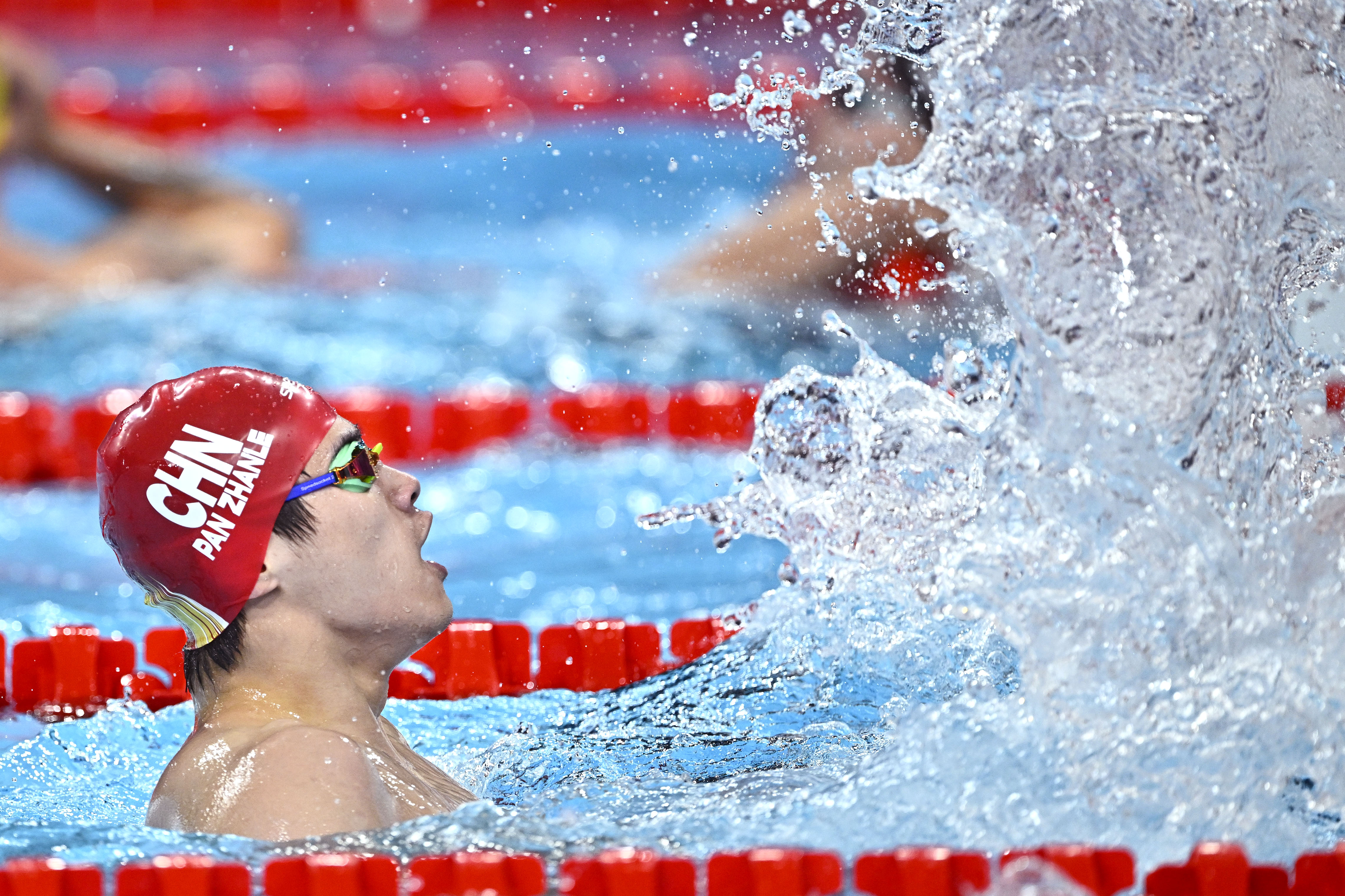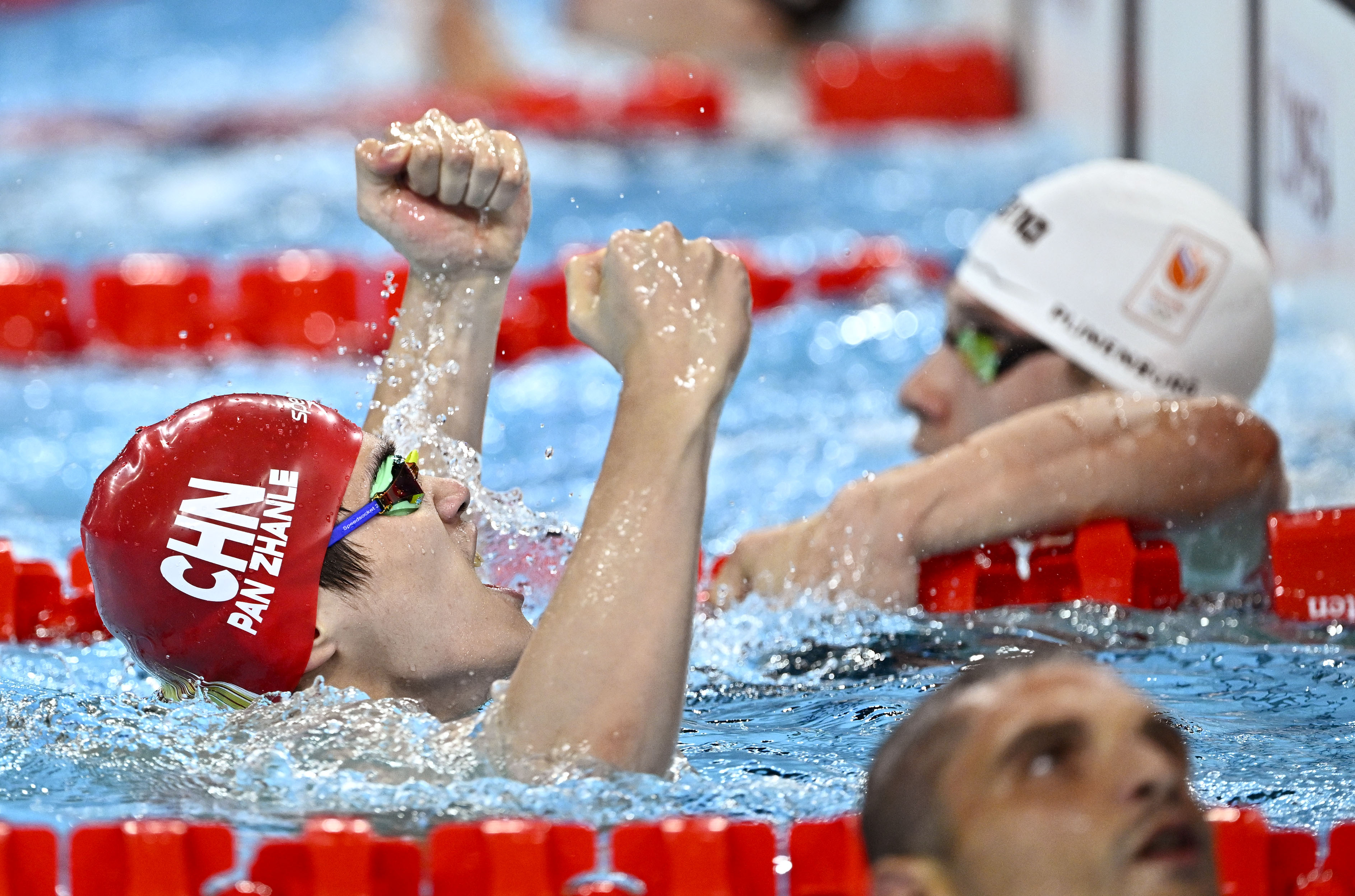 ↑中国队选手潘展乐在比赛后。新华社记者 王鹏 摄