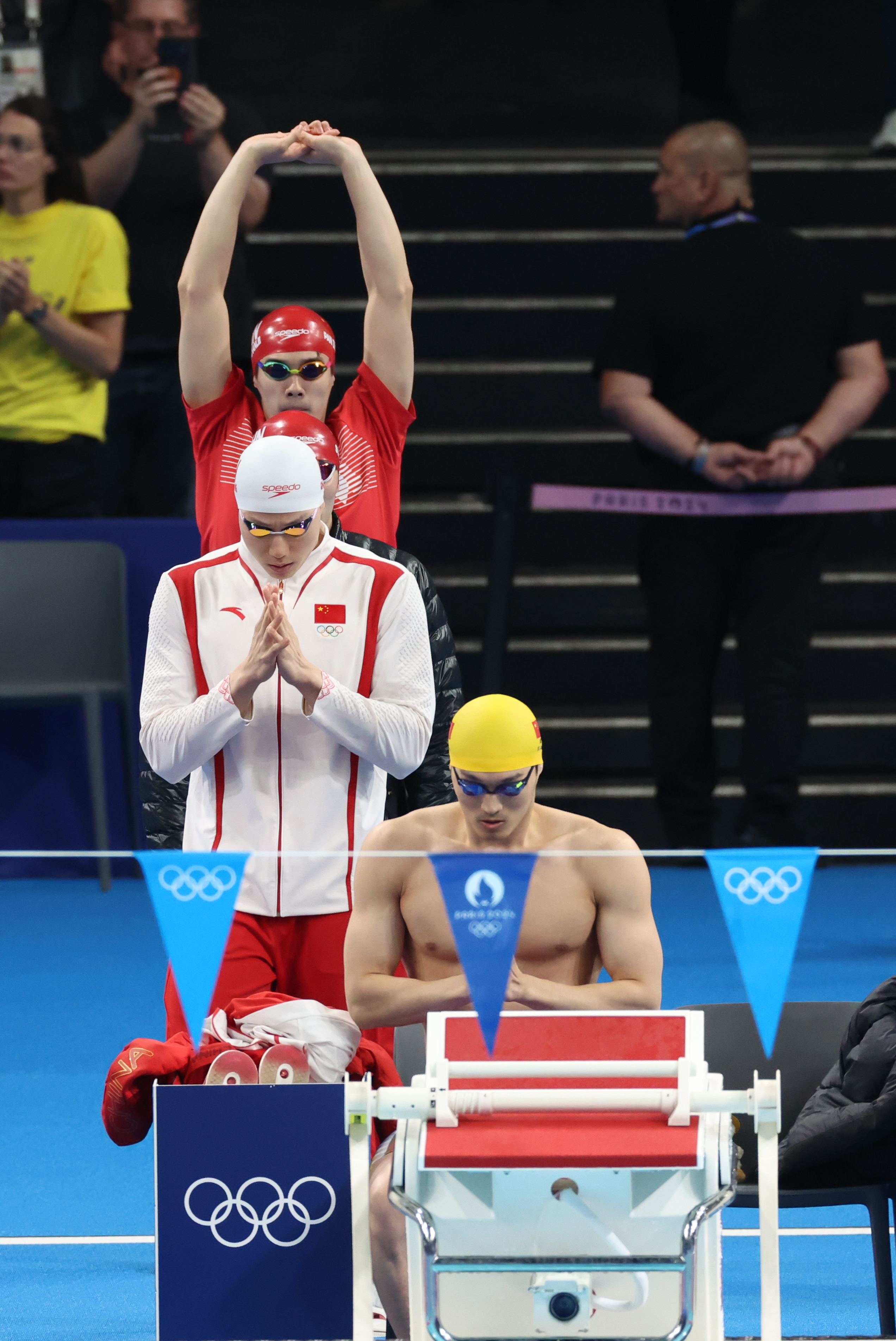 ↑中国队选手徐嘉余、覃海洋、孙佳俊、潘展乐(从左至右)在比赛前入场。新华社记者 黄宗治 摄
