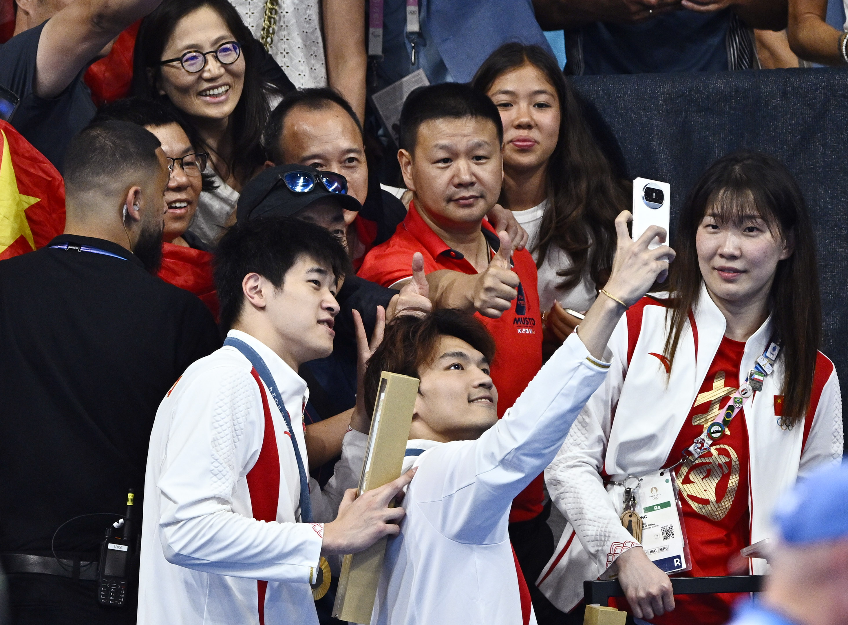 ↑中国队选手潘展乐(前左)、徐嘉余(前中)在颁奖仪式后和观众合影。新华社记者 王鹏 摄