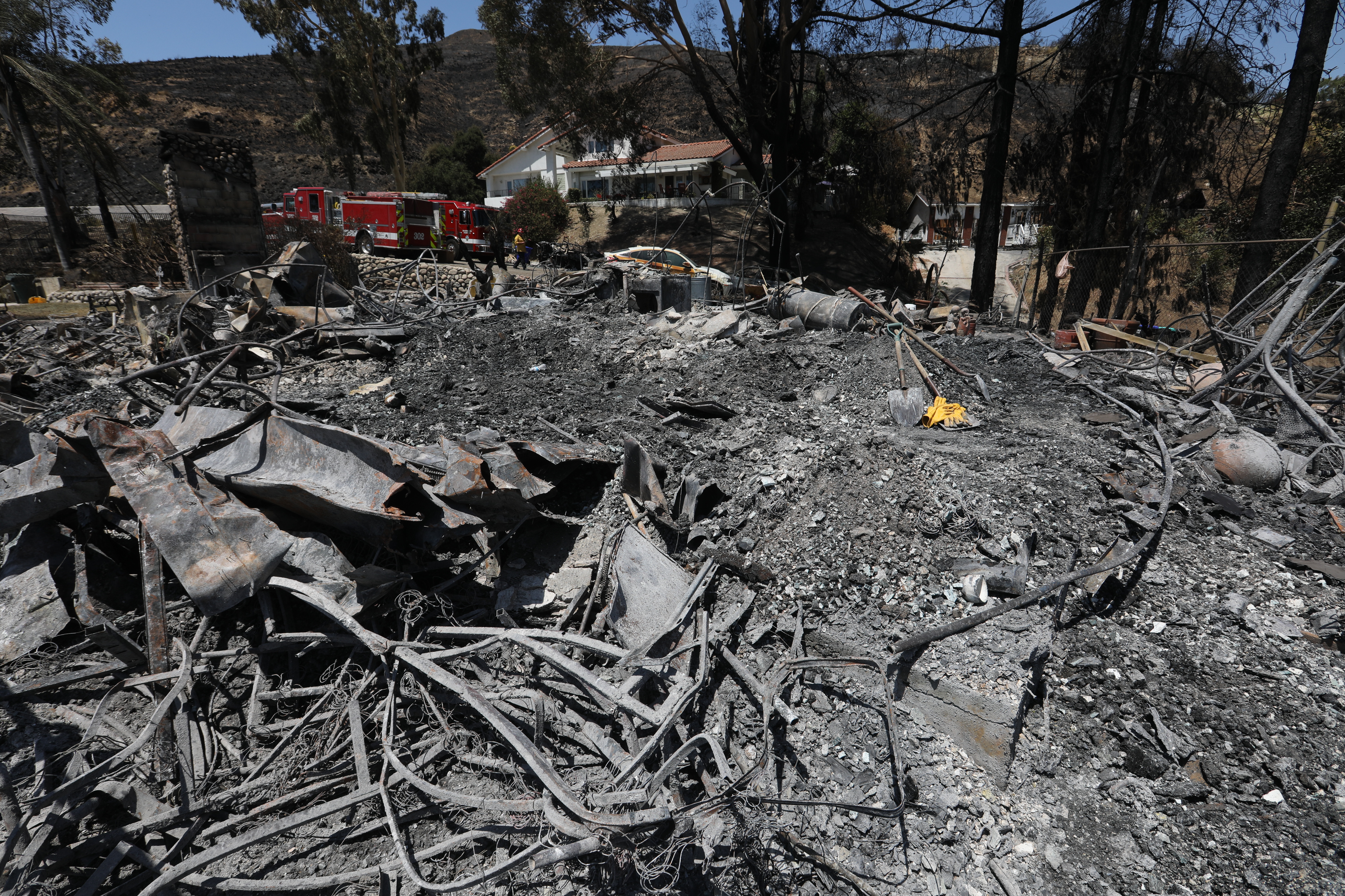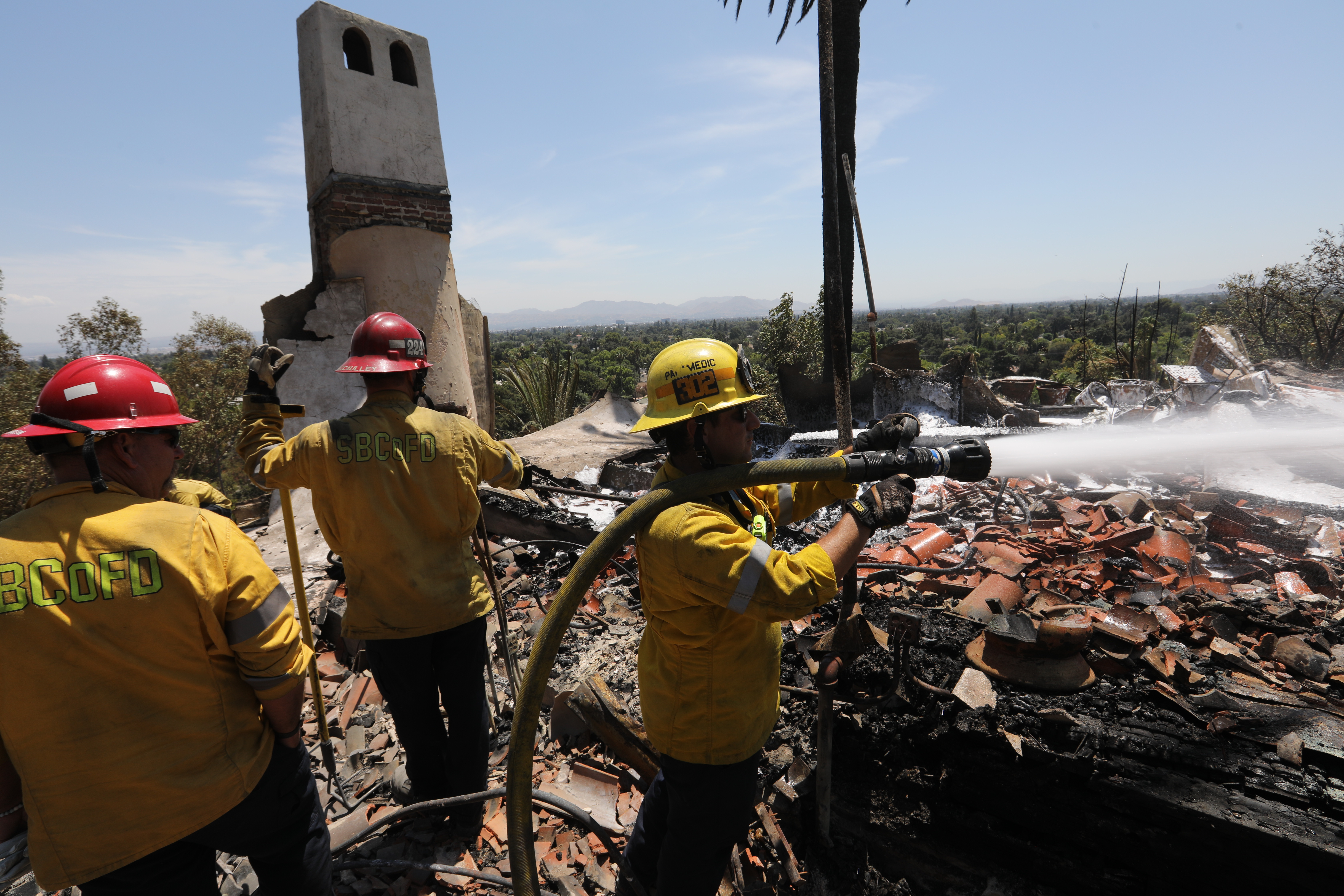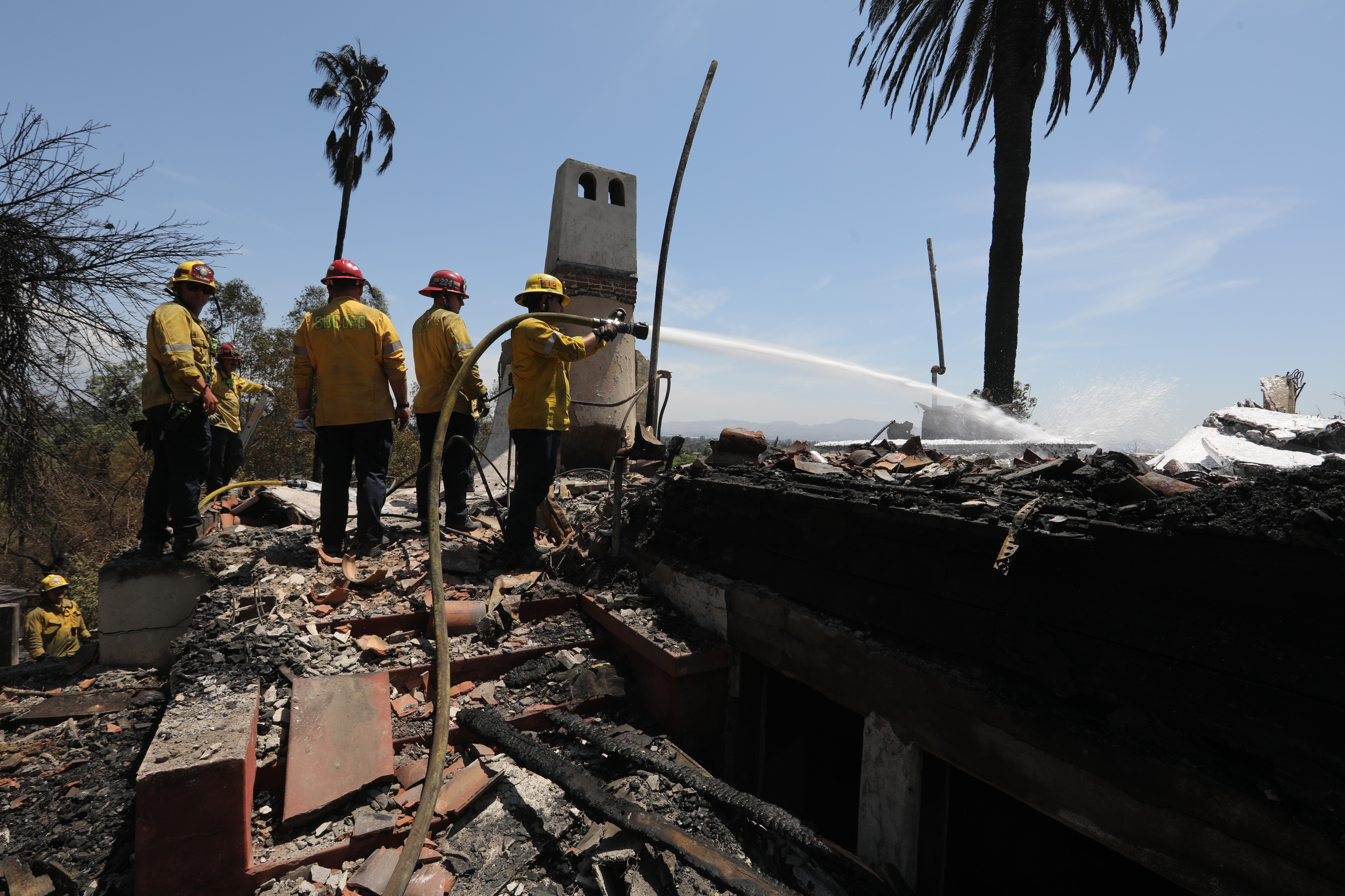 ↑8月6日,在美国加利福尼亚州圣贝纳迪诺,消防员在山火过后的废墟上作业。