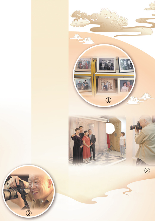 图①:国庆全家福照相馆展示的部分全家福。受访者供图图②:一家人来拍全家福。图③:李国庆在拍照。图②③均为彭浩摄