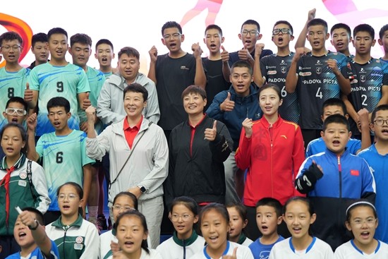9月7日,中国女排队员丁霞以及中国女排前国手冯坤、杨昊与鄂托克前旗第一小学的排球小将们合影。活动主办方供图