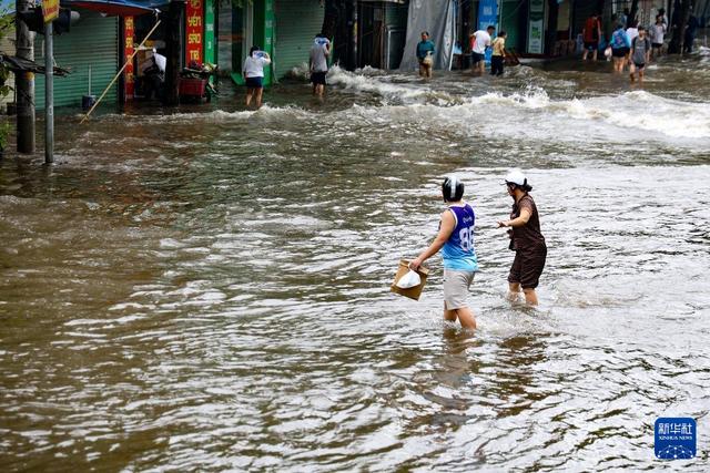 9月10日,在越南首都河内,人们在街道上涉水而行。新华社/越通社