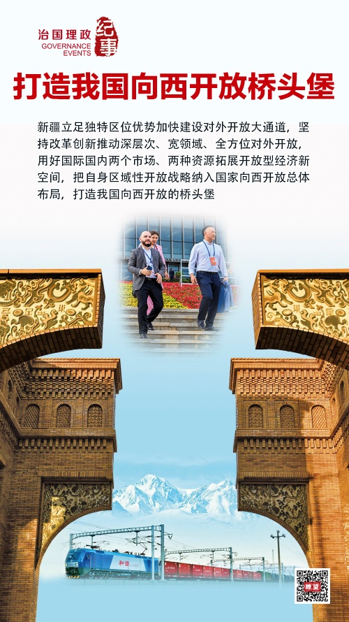◇2023年8月,习近平总书记在听取新疆维吾尔自治区党委和政府、新疆生产建设兵团工作汇报时强调,要发挥新疆独特的区位优势,积极服务和融入新发展格局,从实际出发抓好对外开放工作,加快“一带一路”核心区建设,使新疆成为我国向西开放的桥头堡。