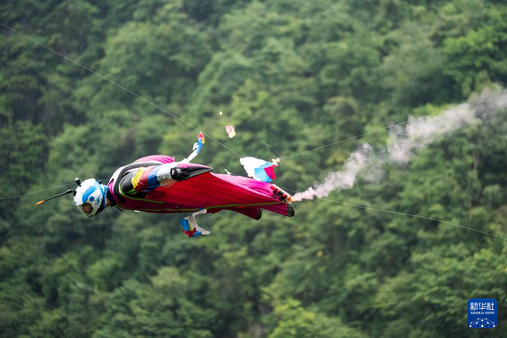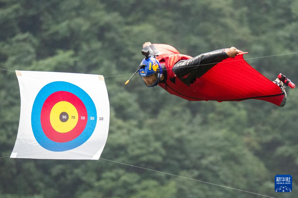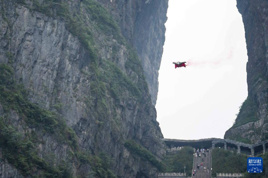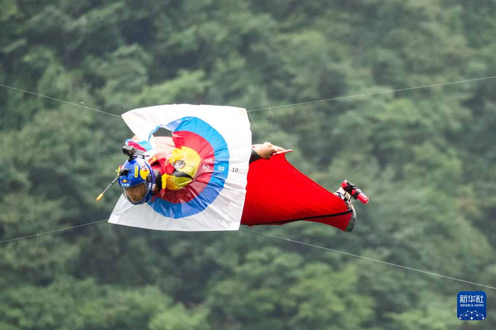 当日,在张家界天门山进行的第十届世界翼装飞行联盟翼装飞行世锦赛精准穿靶赛决赛中,法国选手安布鲁瓦兹·塞拉诺夺冠,南非选手让·雅克·沃利斯和中国选手张树鹏分获亚军、季军。新华社记者 陈思汗 摄