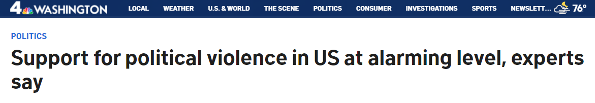 加州大学戴维斯分校(University of California - Davis)的一个小组最近就美国人对政治暴力的支持度进行了调查,结果发现,有25%的受访者认为,为了推进政治目标的暴力通常或总是合理的。虽然这一数字较去年以来略有下降,但这中间潜在的危险却更大,因为支持暴力的人更有可能使用枪支来推动政治目标的实现。