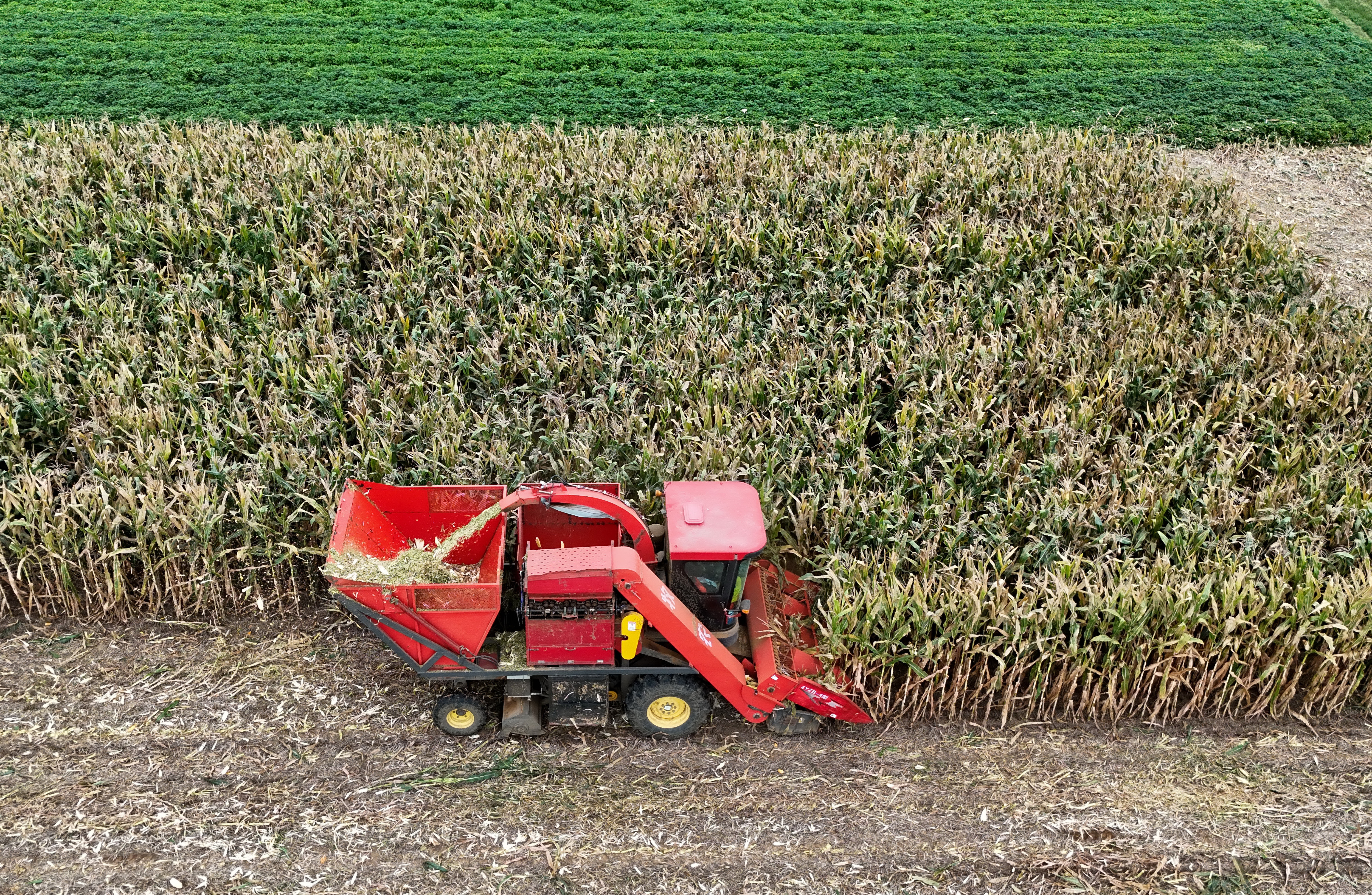 9月11日,河南省宝丰县闹店镇司庄村农民驾驶农机收获玉米。新华社发 (何五昌摄)