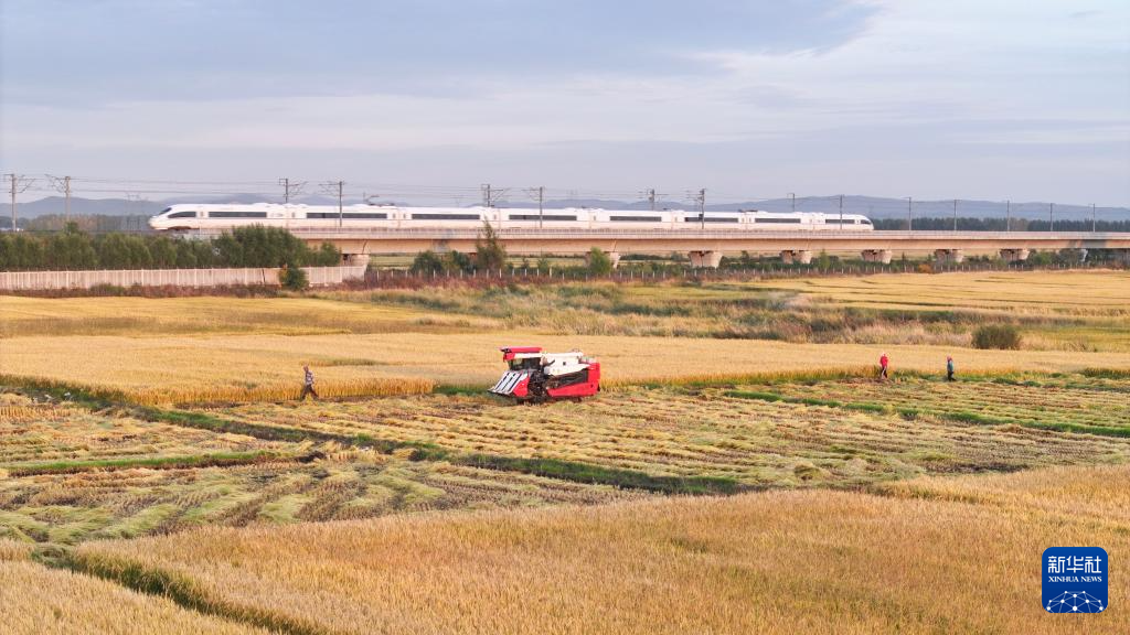 9月23日,在哈尔滨市阿城区,一列火车从丰收的稻田旁经过(无人机照片)。