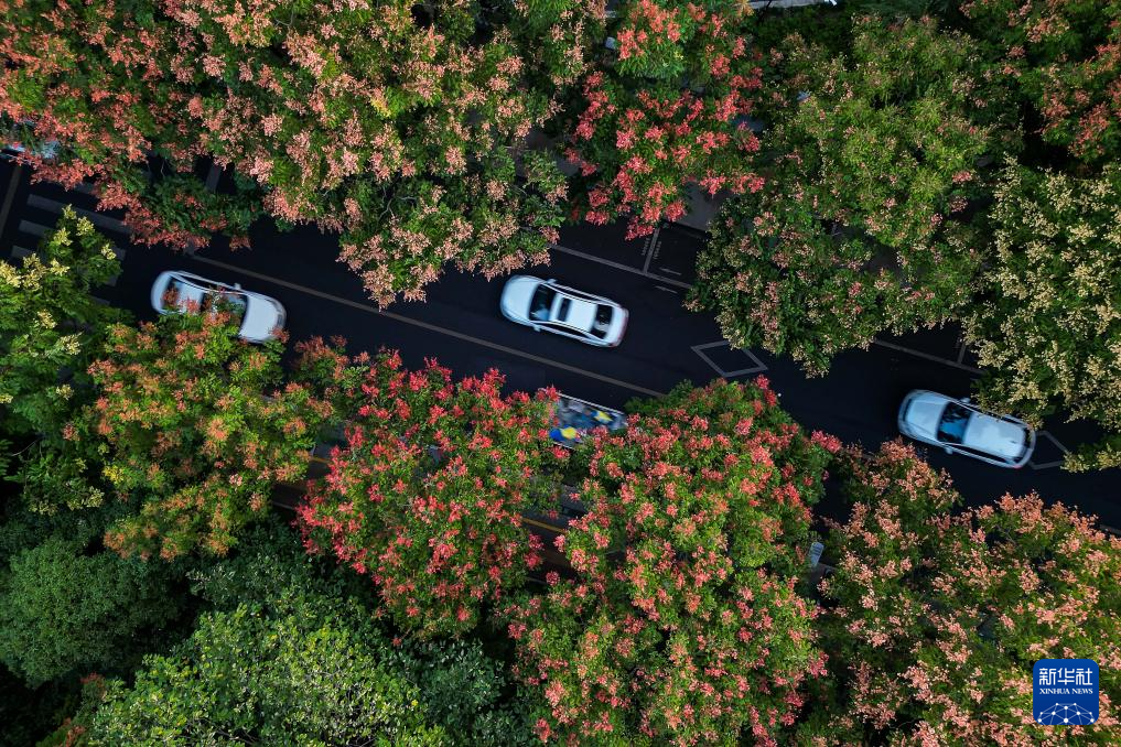 9月23日,在浙江省湖州市吴兴区,成片盛放的栾树花呈现出斑斓色彩(无人机照片)。
