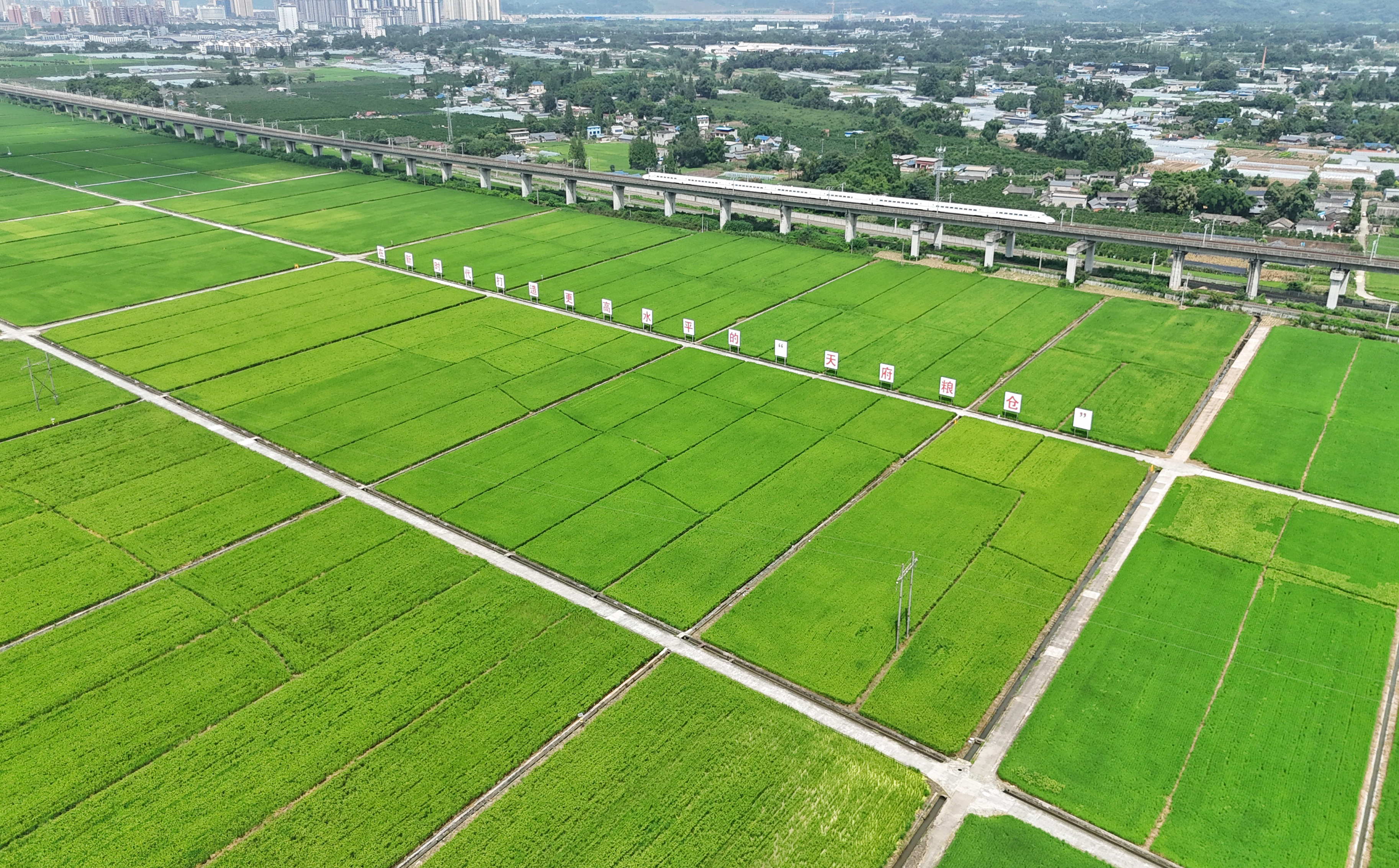 2024年7月26日,一列高铁列车从永丰村高标准农田上方的高架桥上疾驰而过(无人机照片)。