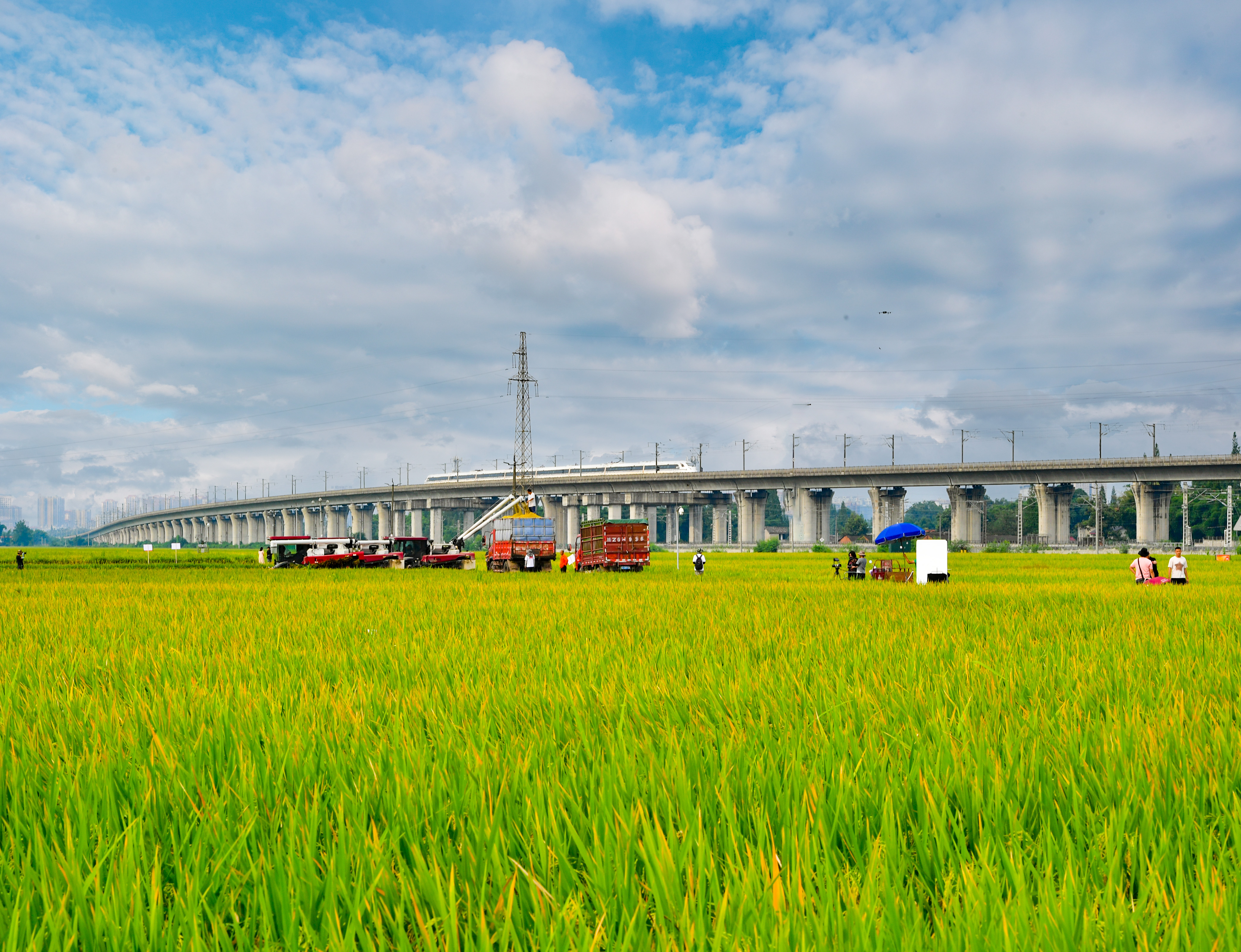 2023年8月28日,收割机在永丰村高标准农田内收割水稻。十多年来,科研团队从500余个省内外优良品种中筛选出29个适合当地种植的高产、优质、宜机化品种在眉山当地大面积应用。