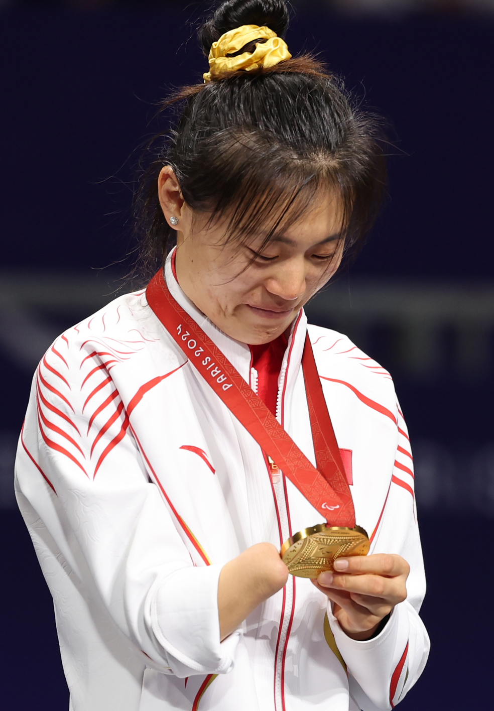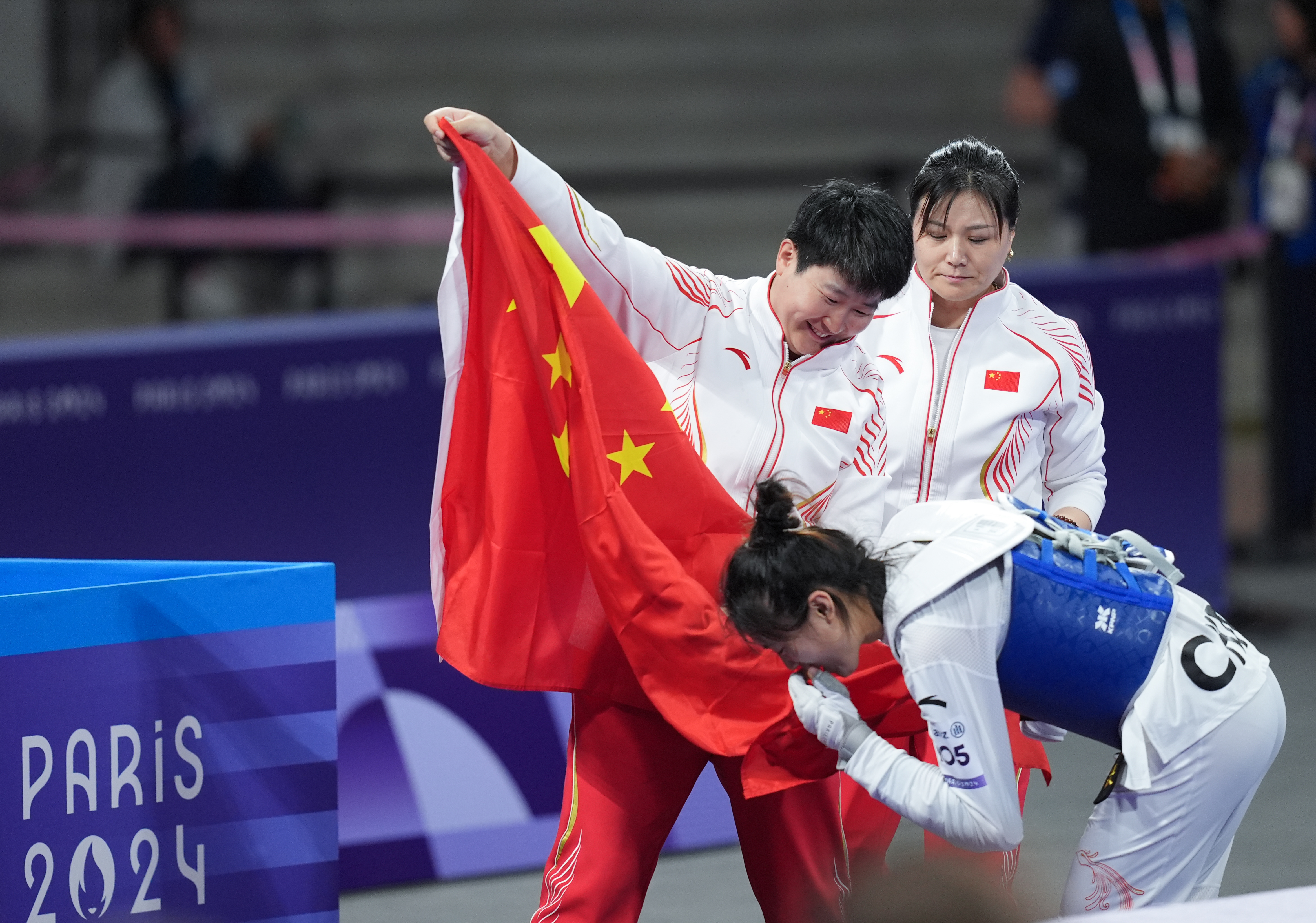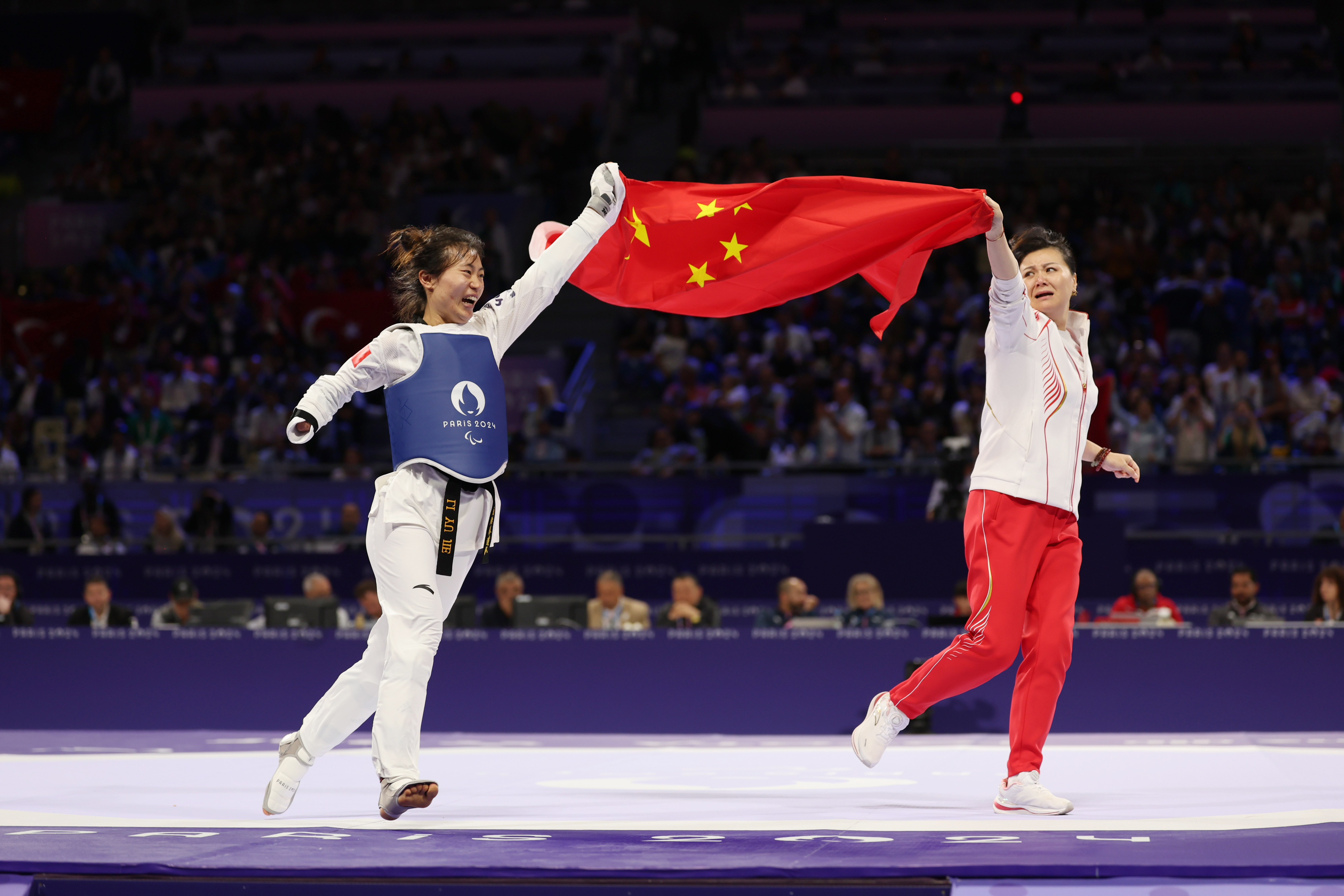 夜幕降临,巴黎大皇宫内灯光璀璨。擂台中央,李羽洁与教练郁洁高擎五星红旗,绕场一周,而后相拥而泣。