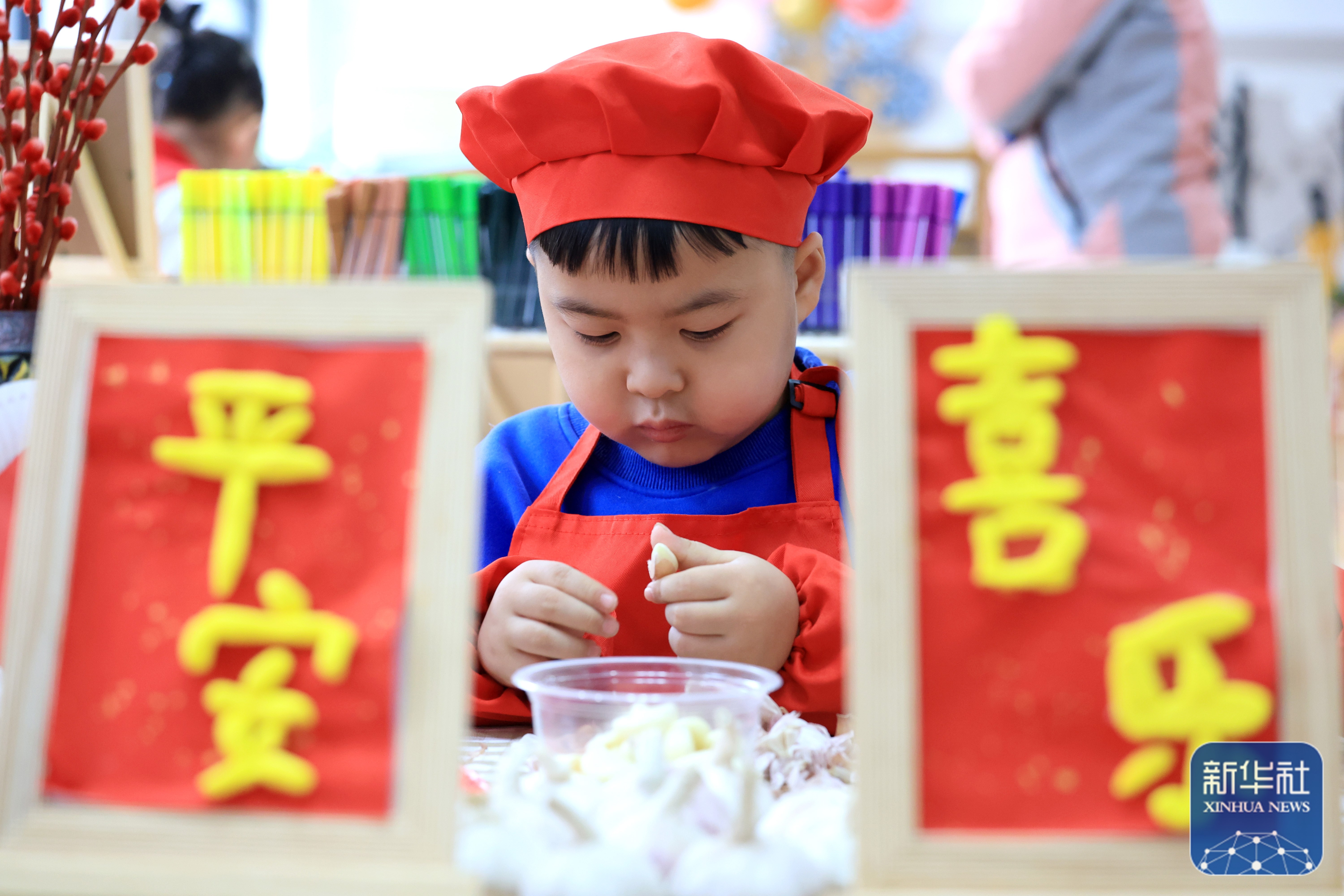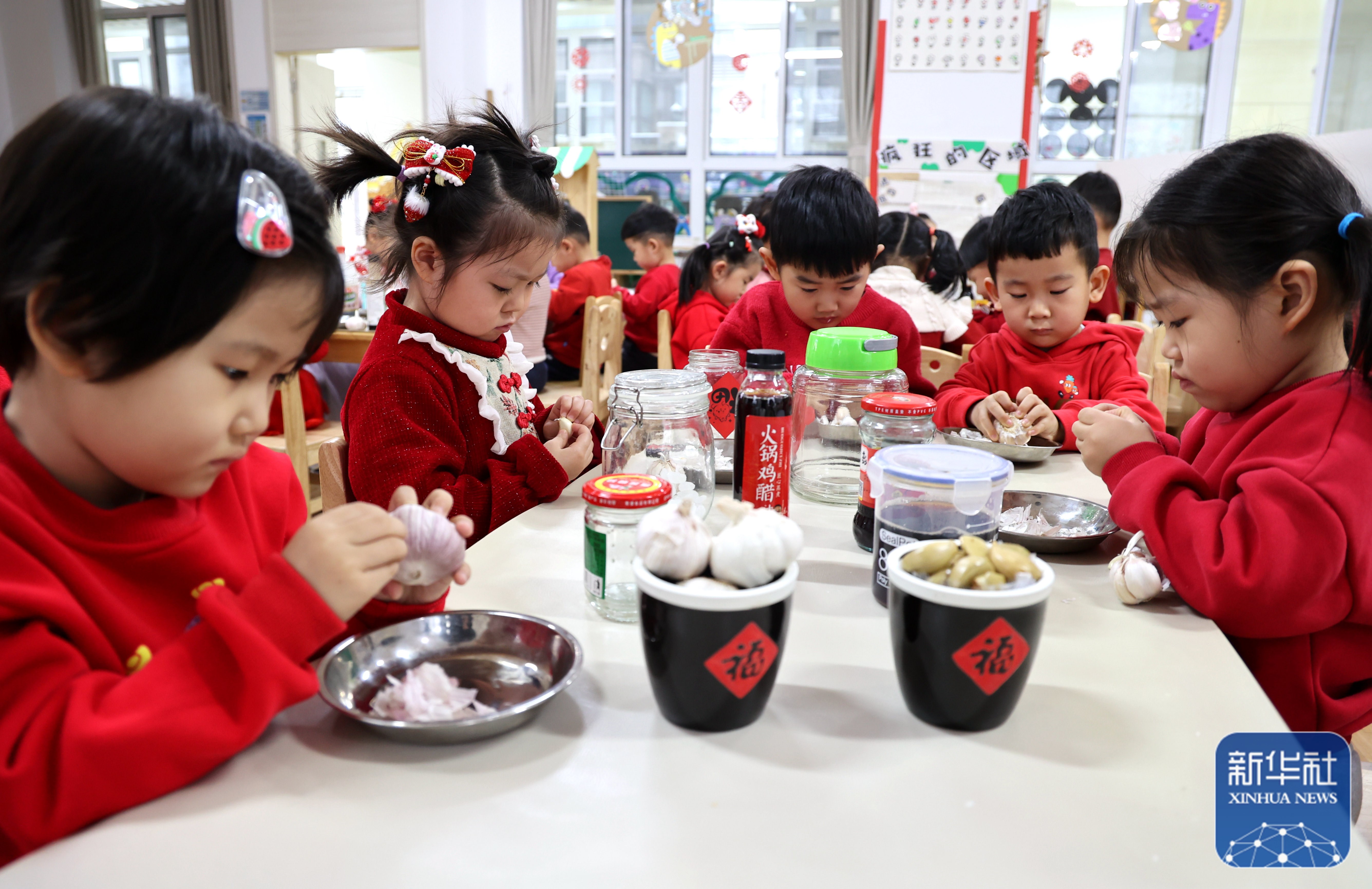 1月17日,山东省滨州市滨城区清怡幼教集团第十一实验幼儿园的孩子们在学习制作腊八蒜。新华社发(初宝瑞 摄)