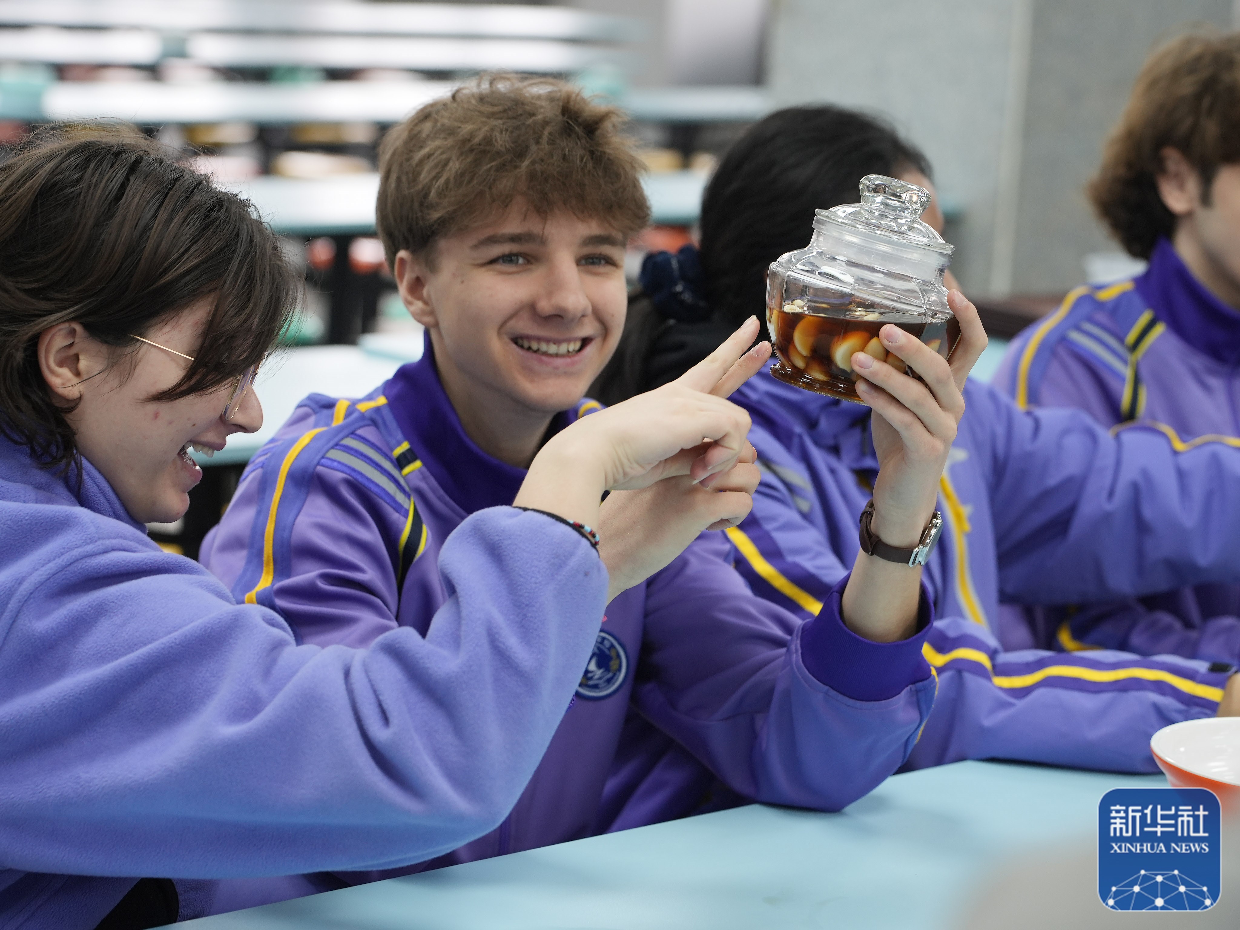1月17日,河北省石家庄市第四十二中学的留学生体验腊八蒜制作。新华社发(闫志国 摄)