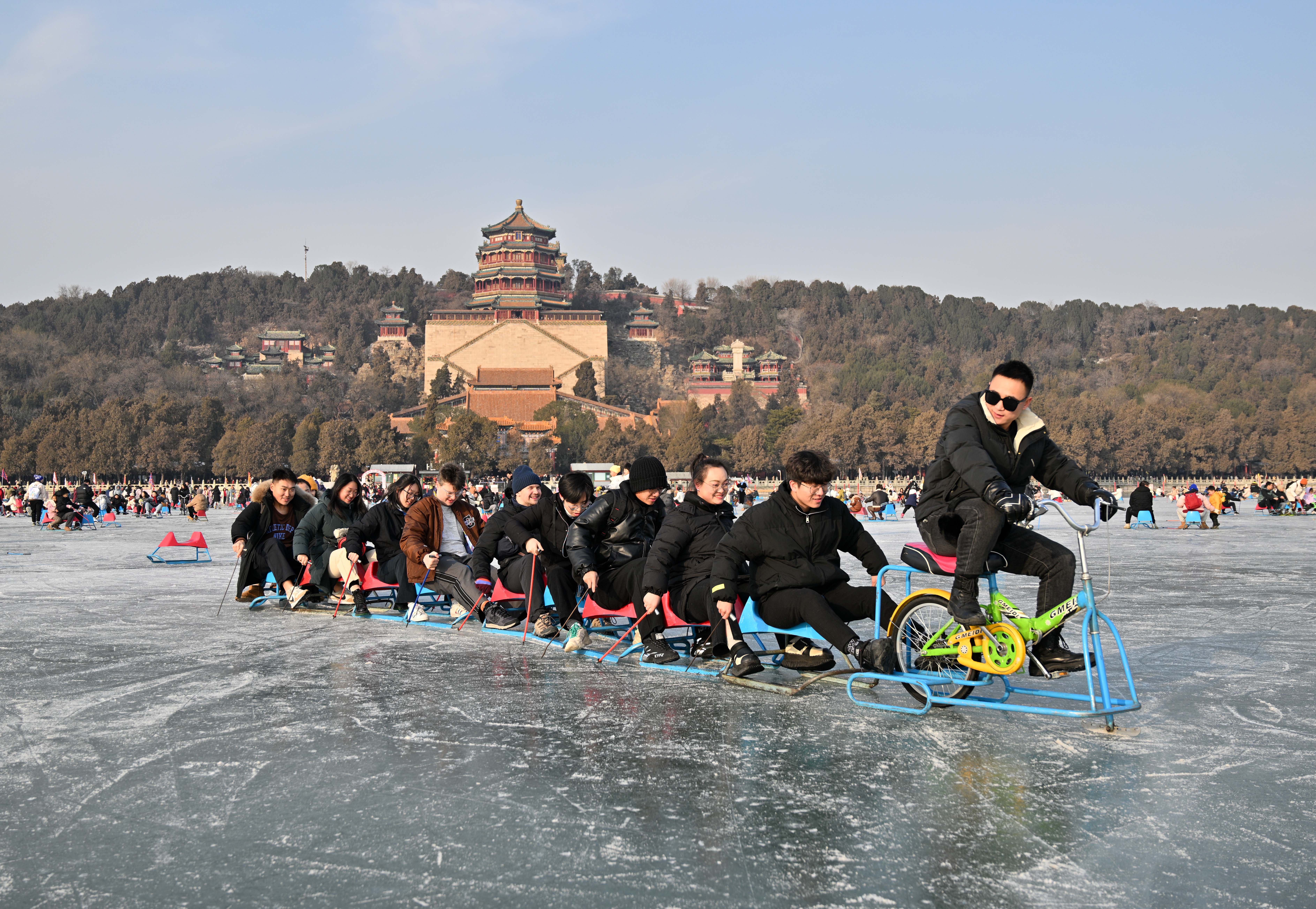 2024年1月1日,游客在北京颐和园冰场玩冰车和冰上自行车。新华社记者 陈晔华 摄
