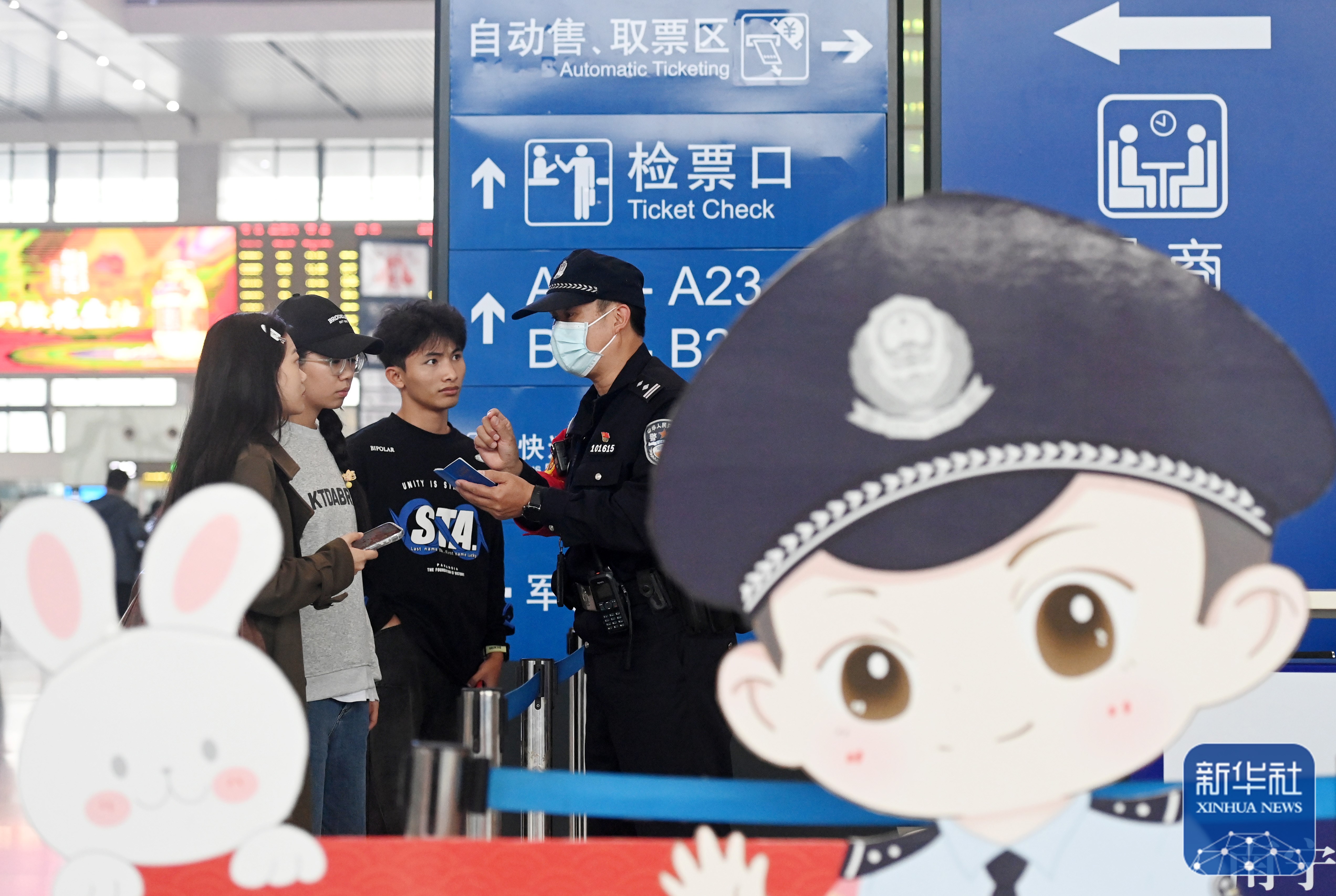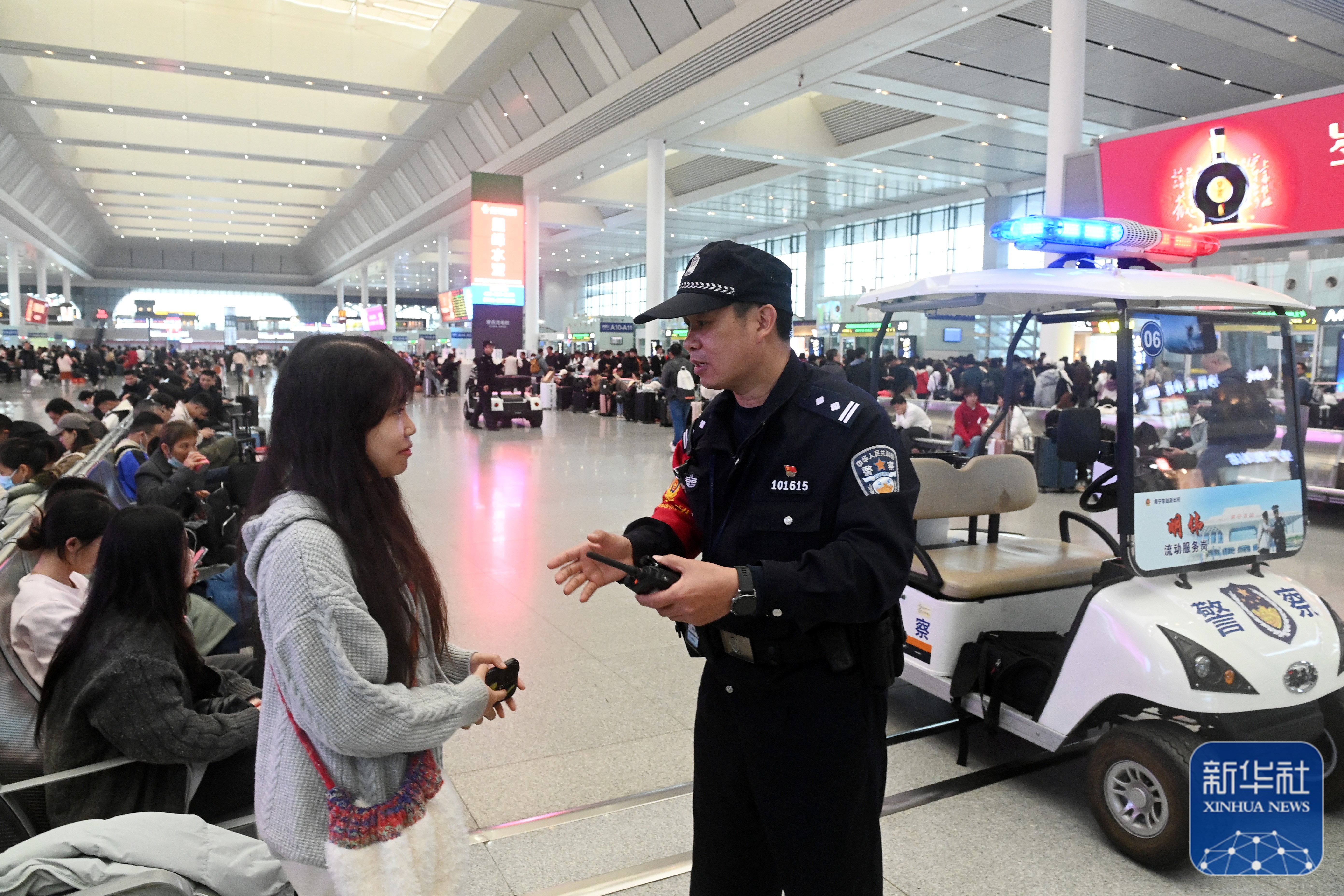 ↑1月8日,高明伟(右一)在南宁东站向旅客解答问题。