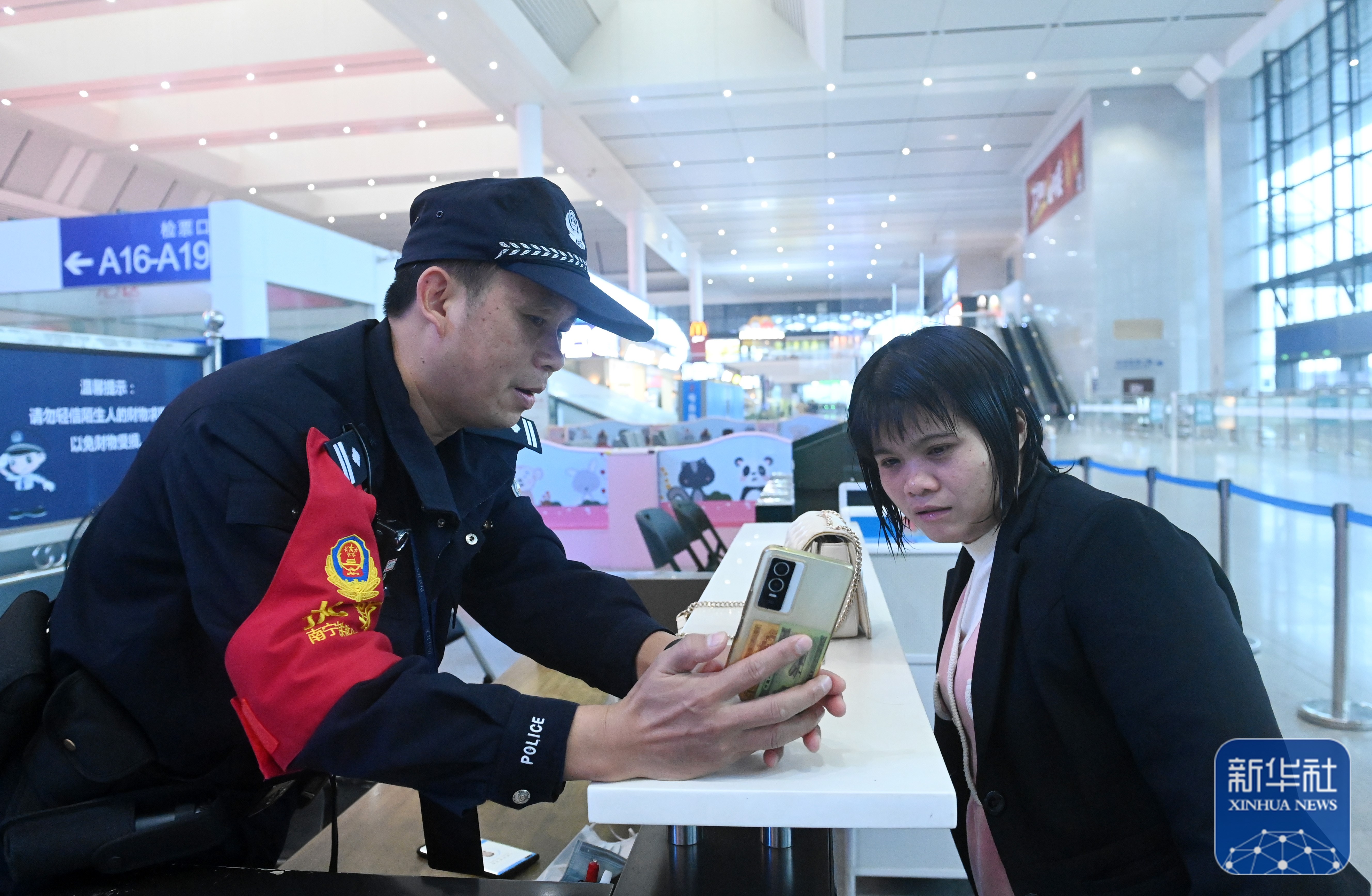 ↑1月8日,高明伟(右)在南宁东站带着旅客到车站服务台领取遗失的证件。