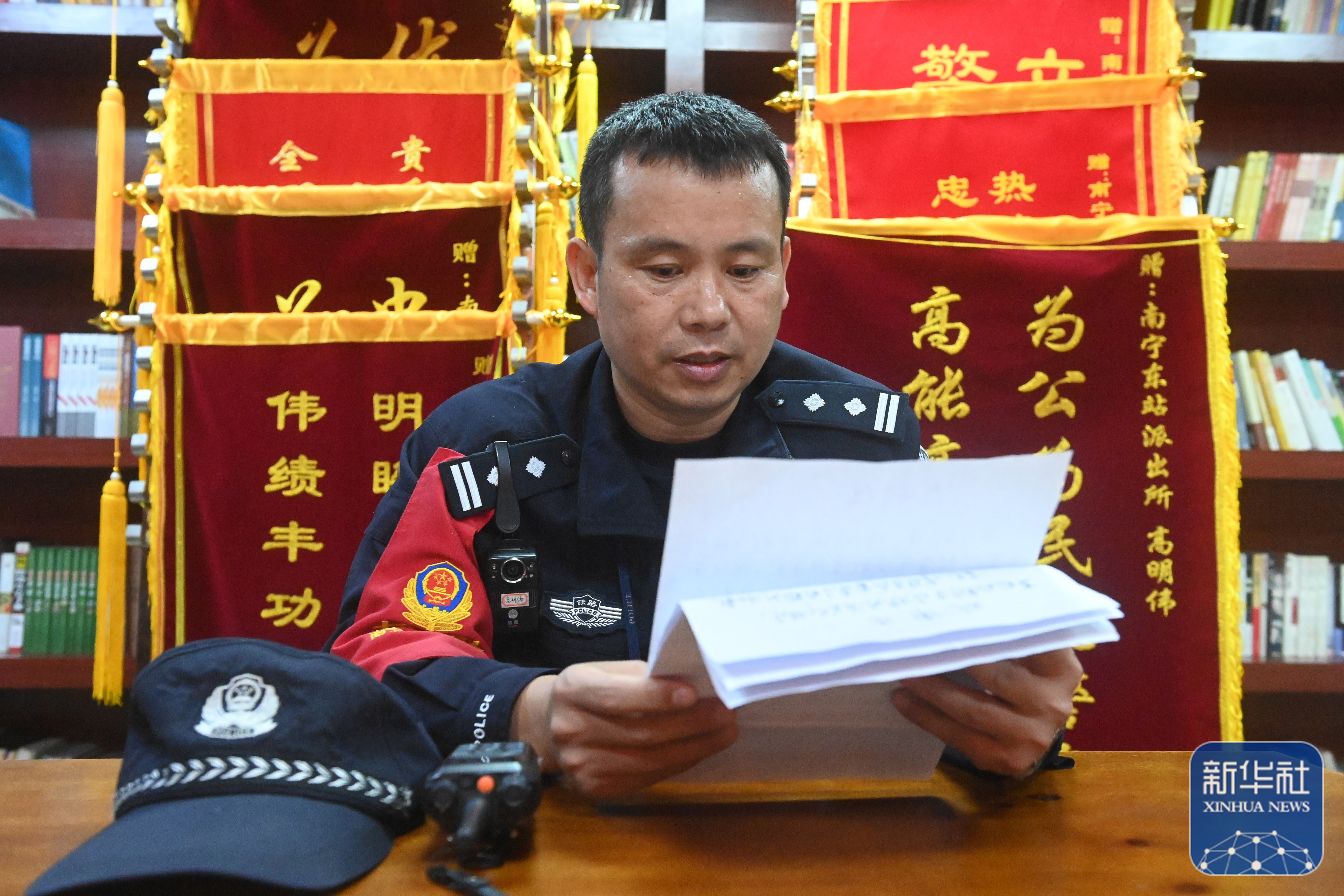 ↑1月8日,高明伟在南宁东站派出所阅读旅客送来的感谢信。