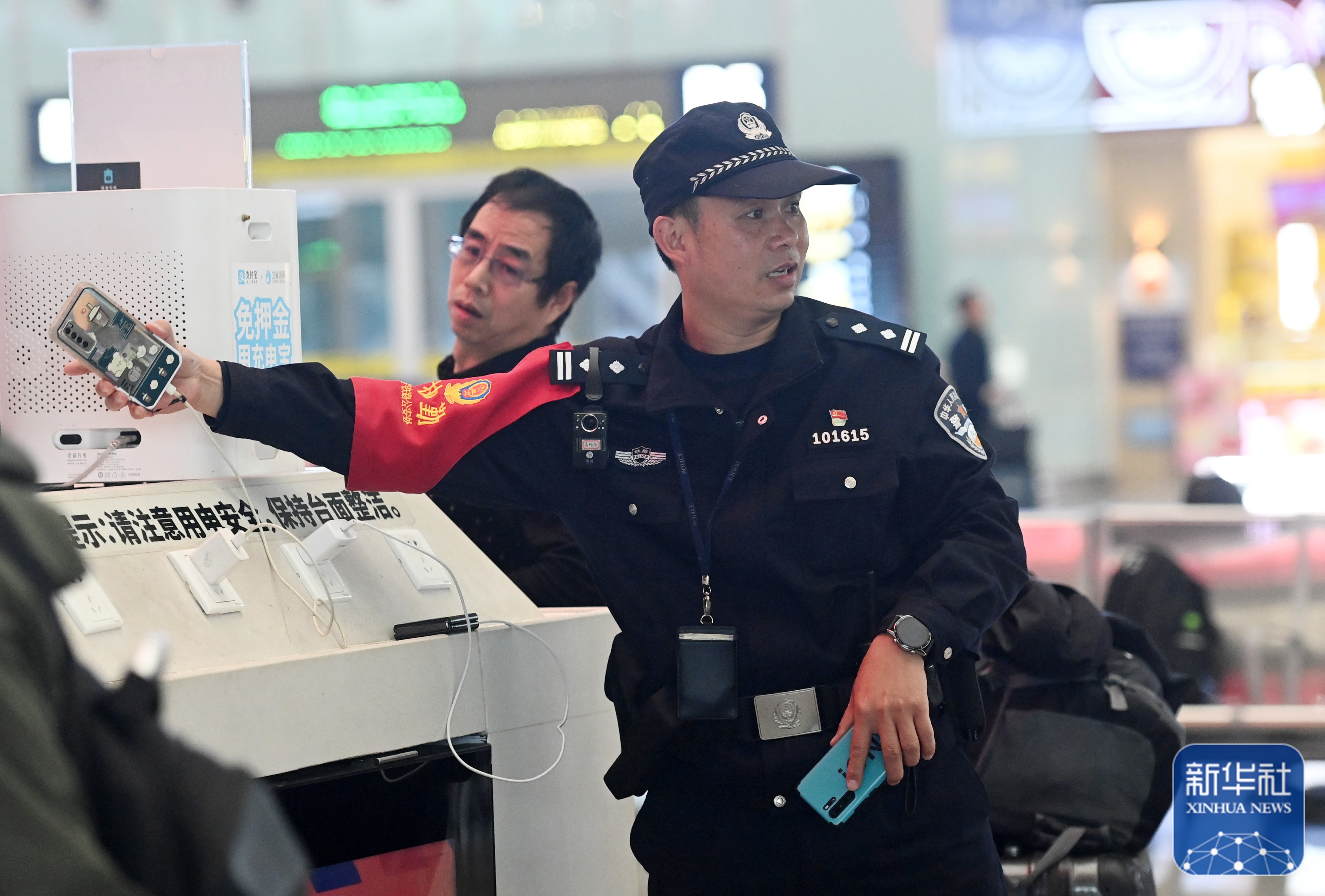↑1月8日,高明伟在南宁东站提醒旅客充电时要注意手机不要离开自己的视线。