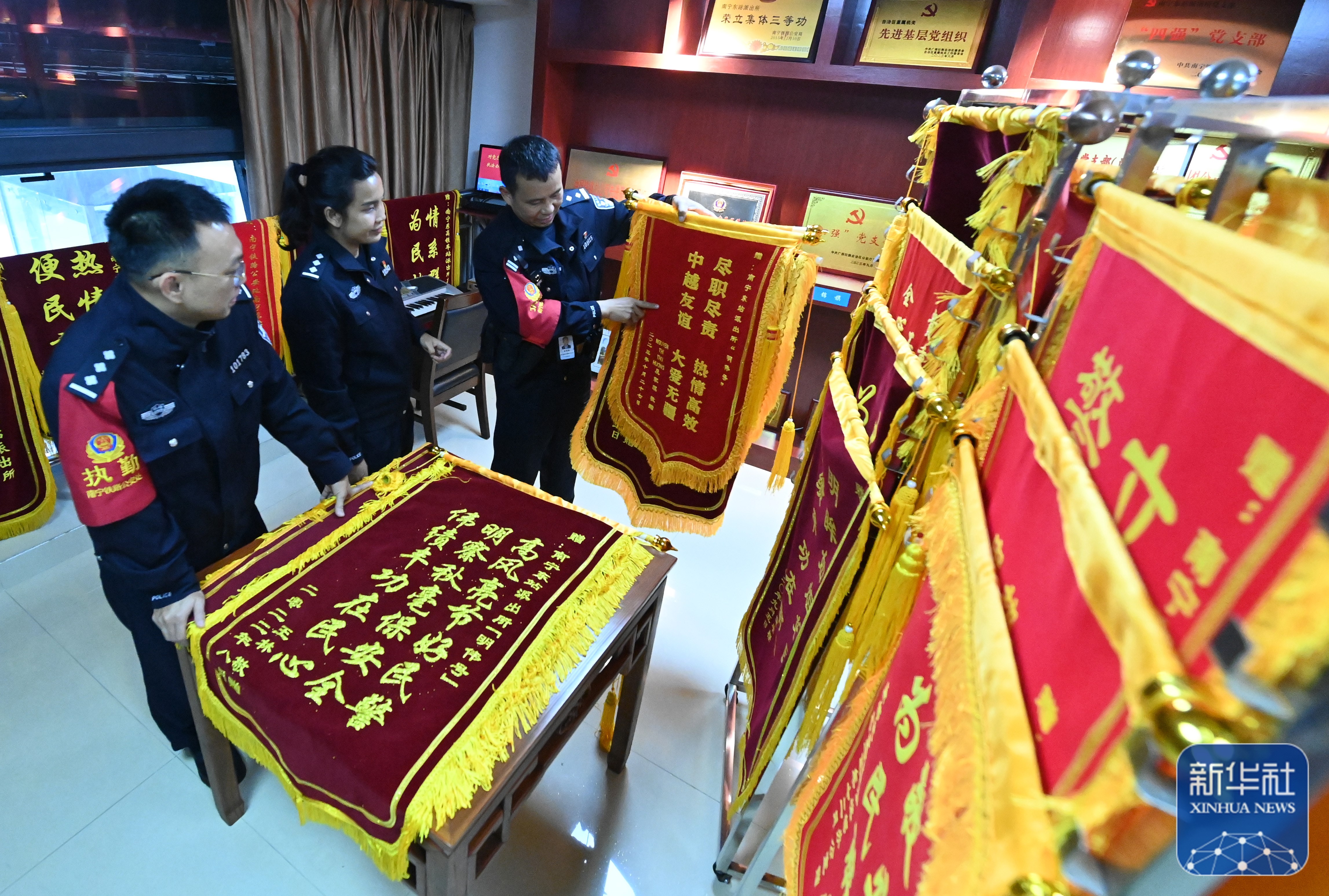 ↑1月8日,高明伟(右)在南宁东站向同事讲述每一面旅客送来的锦旗背后的故事。