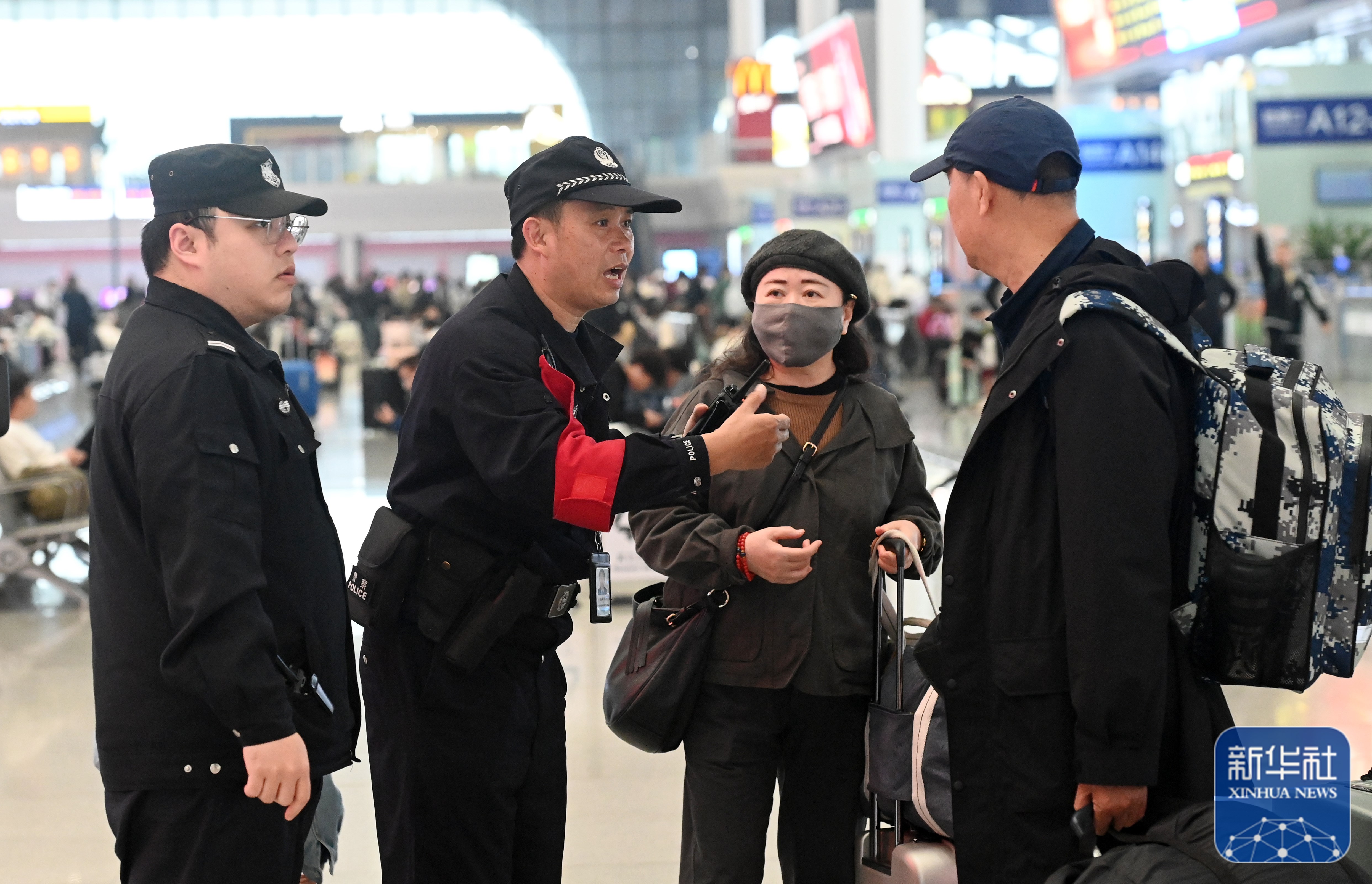 ↑1月8日,高明伟(左二)在南宁东站向旅客解答问题。