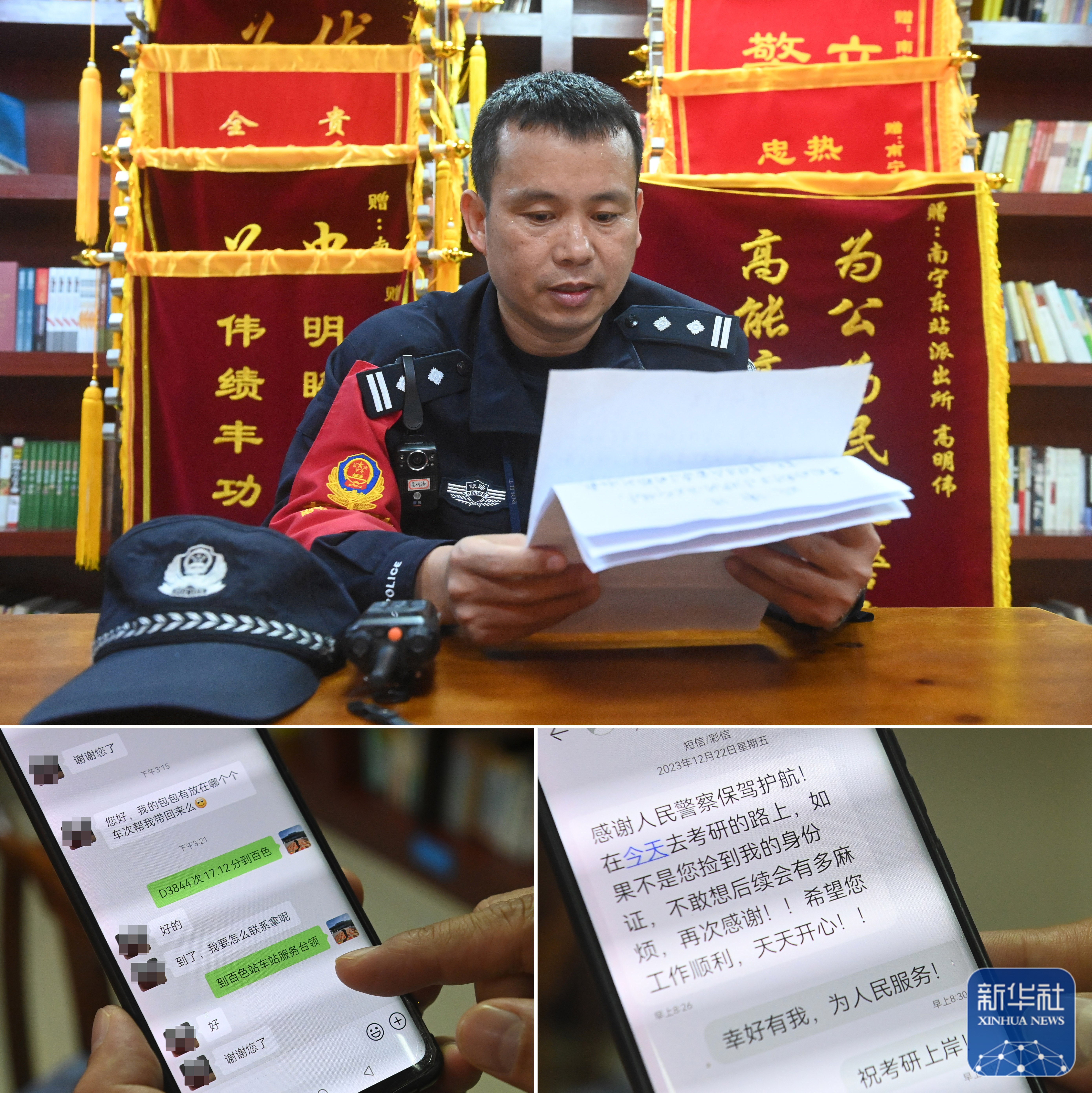 ↑这是一张拼版照片,上图是1月8日,高明伟在南宁东站派出所阅读旅客发来的感谢信;下图是旅客发来的感谢信息。