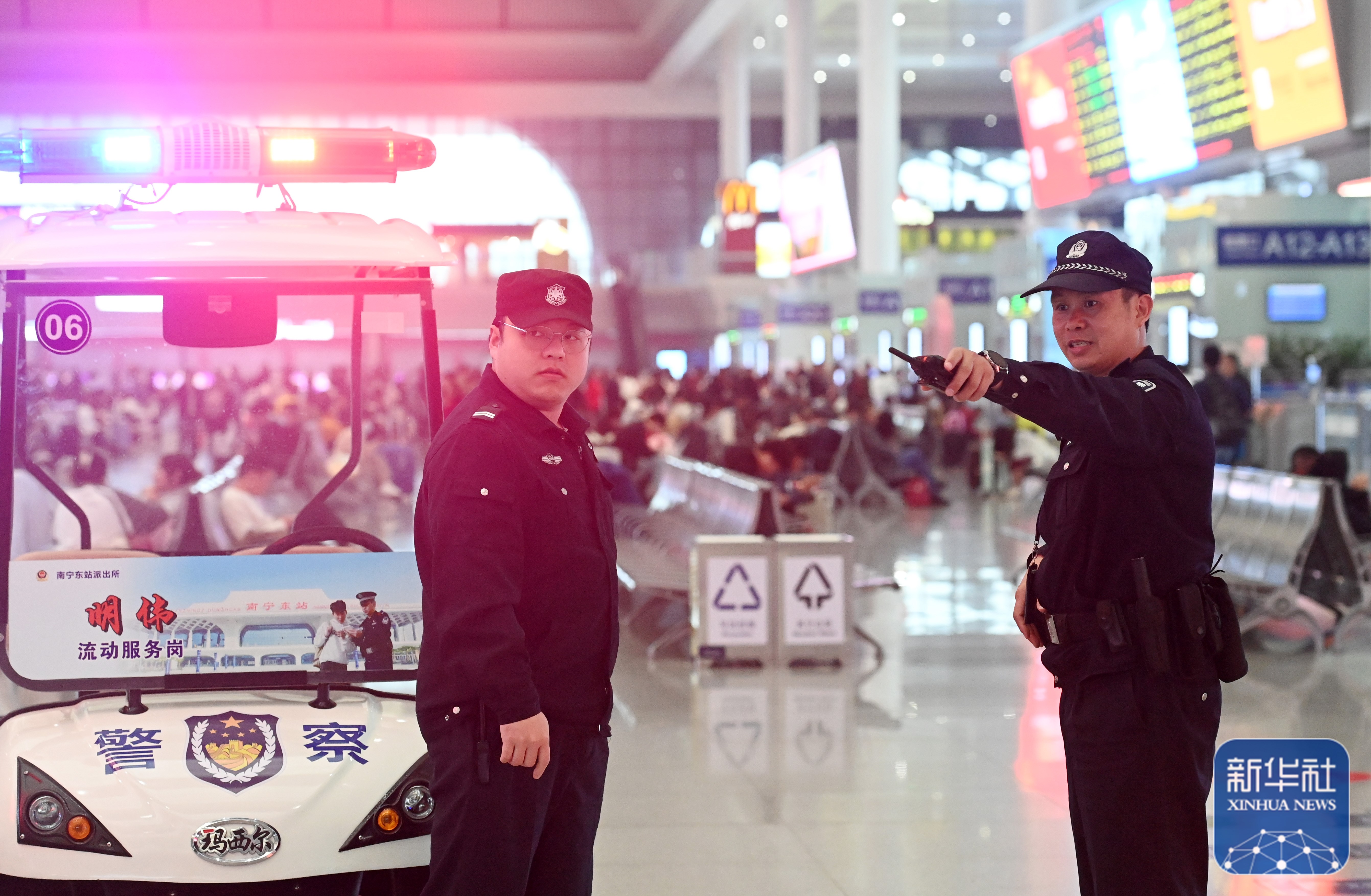 ↑1月8日,高明伟(右)和同事在南宁东站执勤。