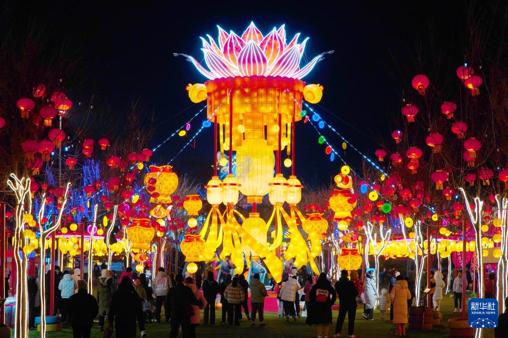 1月4日,人们在2024年淄博玉黛湖花灯会上赏灯游览。新华社记者 徐速绘 摄