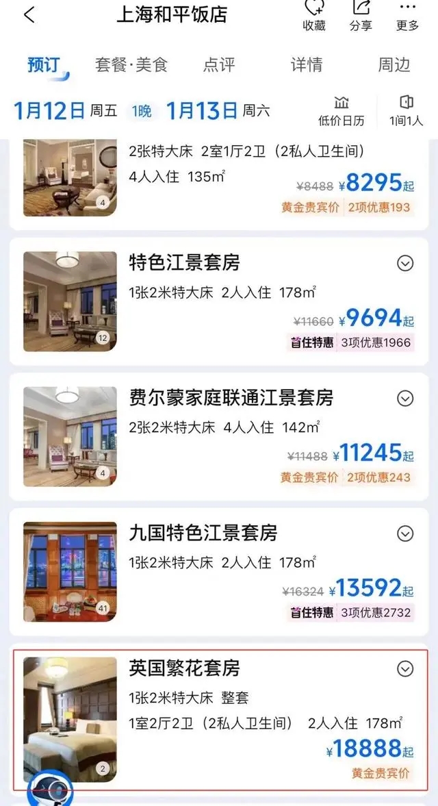 剧中出镜率极高的和平饭店英国套房也成了“热门产品”。目前,和平饭店英国套房在旅游平台上被命名为“英国繁花套房”。9日查询携程旅行平台发现,9-11日该套房已售罄,12日入住一晚的价格为18888元。据媒体此前报道,这一套房在今年春节期间含早价为22888元一晚。