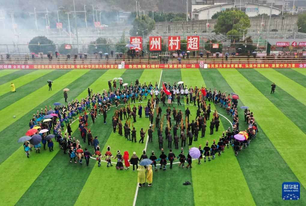 1月6日,人们在2024年贵州“村超”预选赛开幕式上表演民族节目(无人机照片)。新华社发(杨文舒摄)