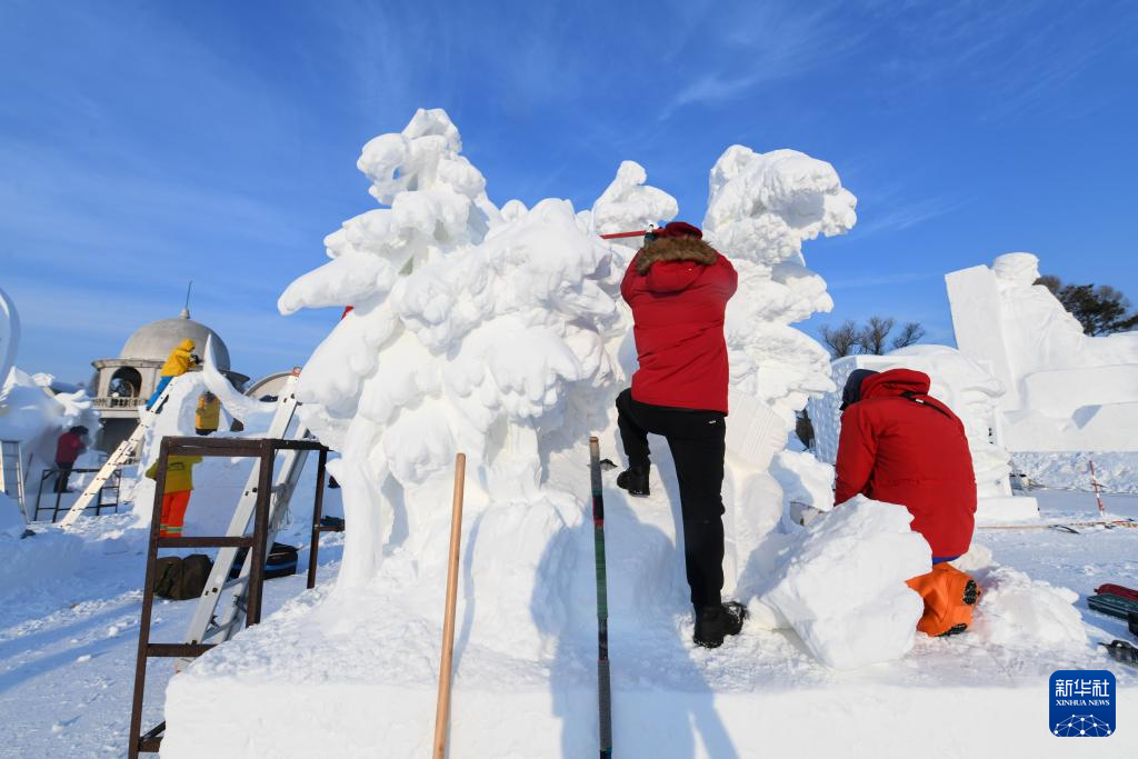 1月8日,选手在太阳岛雪博会园区内制作雪雕。新华社记者 王松 摄