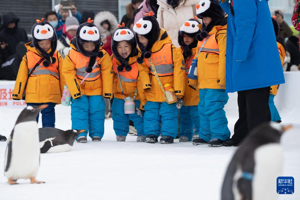 1月6日,在哈尔滨极地公园,“小砂糖橘”与企鹅进行互动。新华社记者 张涛 摄