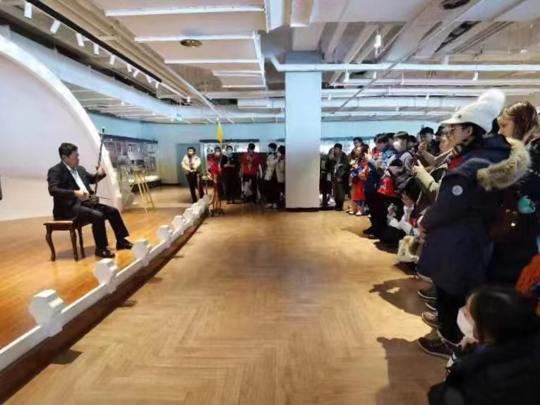 哈尔滨音乐博物馆馆长苗笛为参观的游客演奏六弦琴。(哈尔滨音乐博物馆供图)