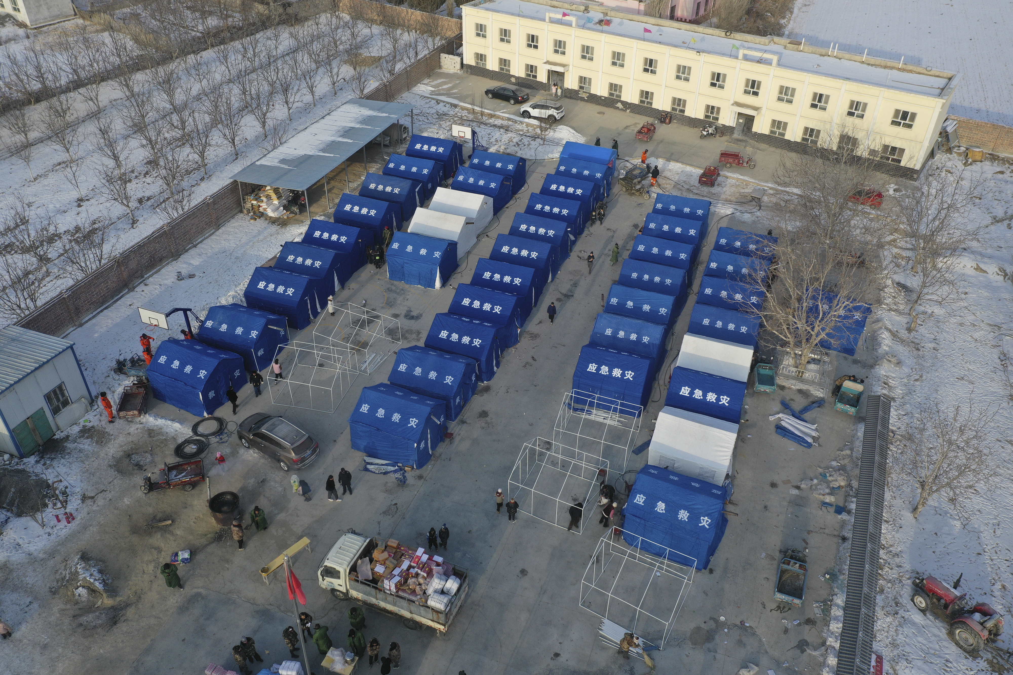 23日晚上9点,室外气温已降到零下13℃,距离此次地震震中最近的乌什县亚曼苏柯尔克孜族乡安置点一片忙碌,不断有物资运抵,不停有志愿者到达。木尼热的父亲吐拉克·艾沙正和救援人员一起搭建帐篷。