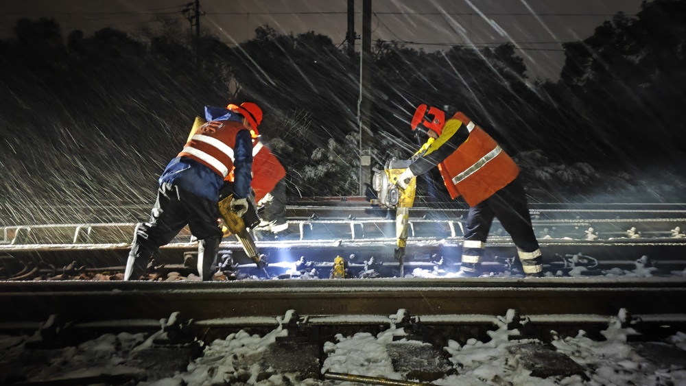 南昌工务段新干线路车间对线路道岔道床进行捣固。(中国铁路南昌局集团有限公司党委宣传部供图)
