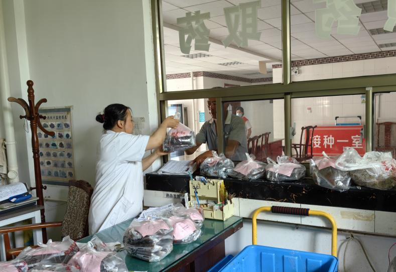 2023年6月20日,山东省聊城市东阿县刘集中心卫生院工作人员在分发中药汤包。新华社记者张力元 摄