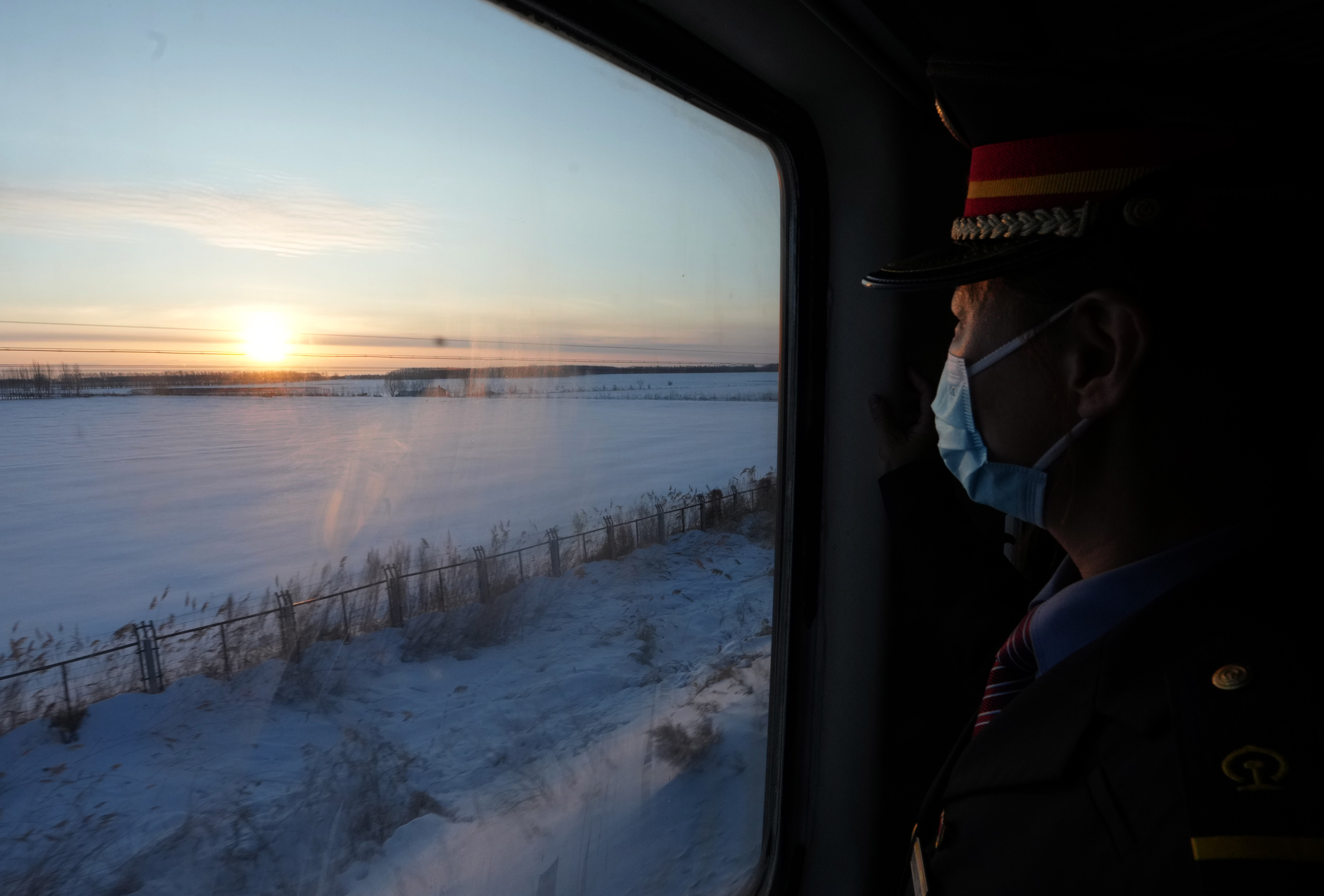1月23日,在哈尔滨开至抚远的K7065次列车上,通宵值班的列车员迎接日出。