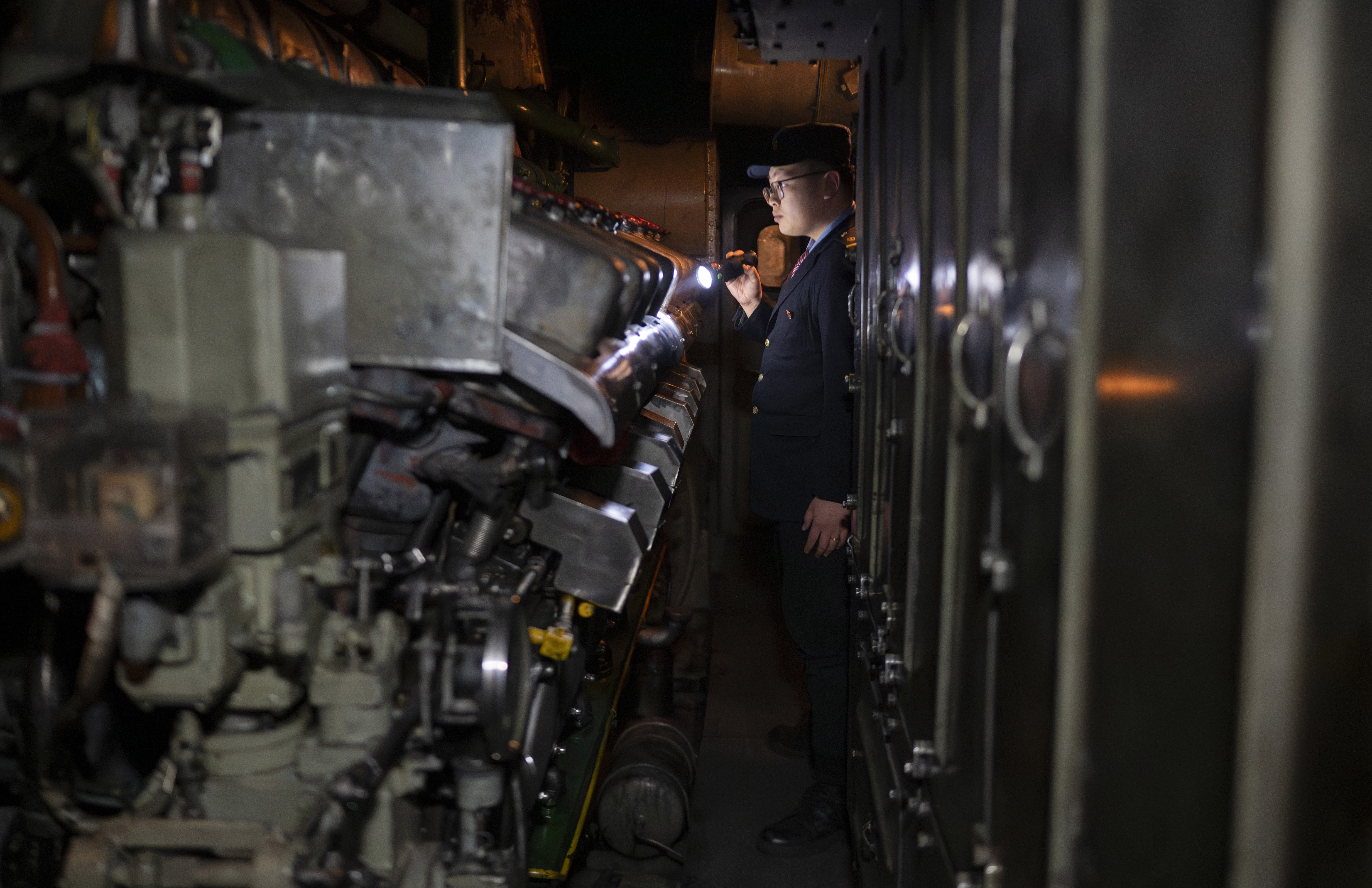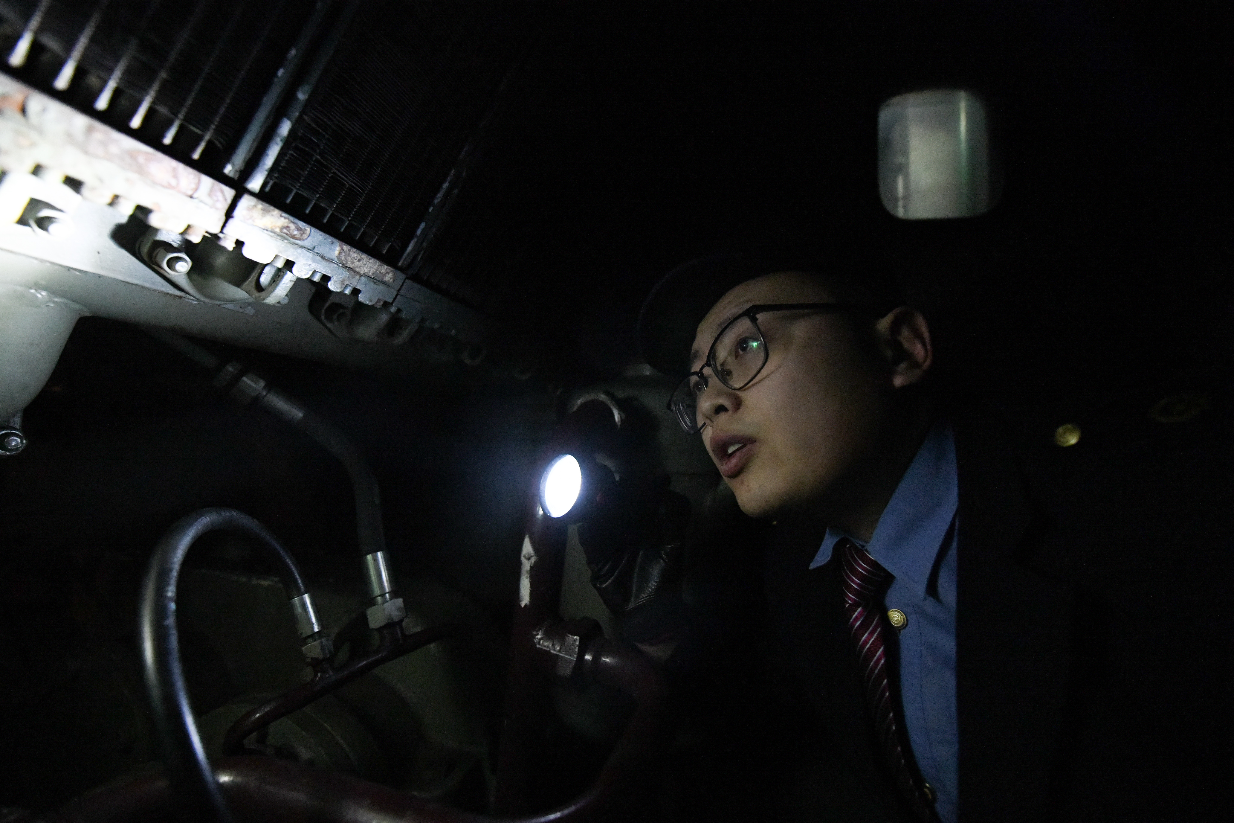 1月23日,在哈尔滨开至抚远的K7065次列车上,机车副司机徐瑞南在机械间巡检。