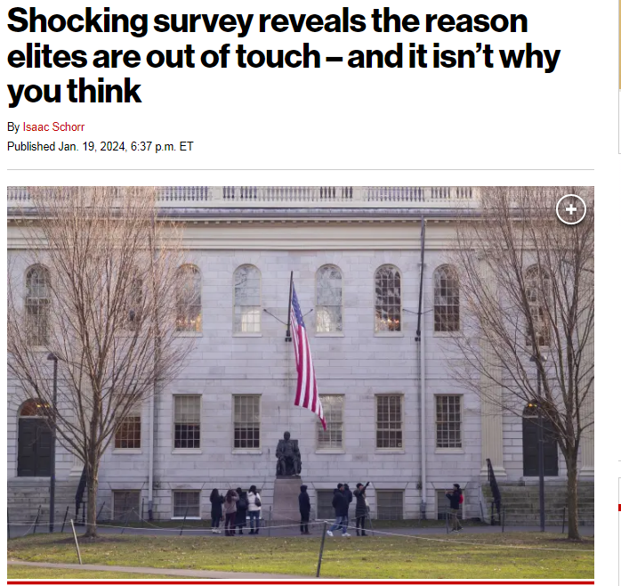 《纽约邮报》网站近期报道,民调专家斯科特·拉斯穆森受智库“释放繁荣委员会”委托进行的一项新调查清楚地说明了这个问题。该调查将受访者分为精英和普通民众。拉斯穆森称,他经常看到三个团体——拥有研究生学位;年收入超过15万美元;居住在人口密集的城市地区的人士和普通民众对事物的看法截然不同。