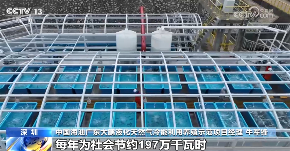 中国海油广东大鹏液化天然气冷能利用养殖示范项目经理 牛军锋:据测算,1立方米的海水温度下降5摄氏度,需要消耗5.8千瓦的能量,该项目利用的冷能相当于每年为社会节约197万千瓦时,减排二氧化碳1800吨,是典型的绿色低碳循环经济。
