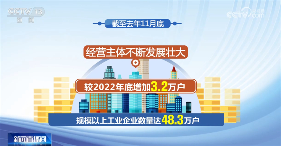 数据显示,截至去年11月底,规模以上工业企业数量达48.3万户,较2022年底增加3.2万户,经营主体不断发展壮大。制造业PMI生产经营活动预期指数自2023年10月连续3个月上升,全年指数均高于临界点,制造业企业对发展信心稳定恢复。