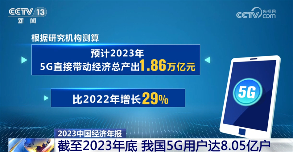 截至2023年底,我国5G移动电话用户达8.05亿户。根据研究机构测算,预计2023年5G直接带动经济总产出1.86万亿元,比2022年增长29%。
