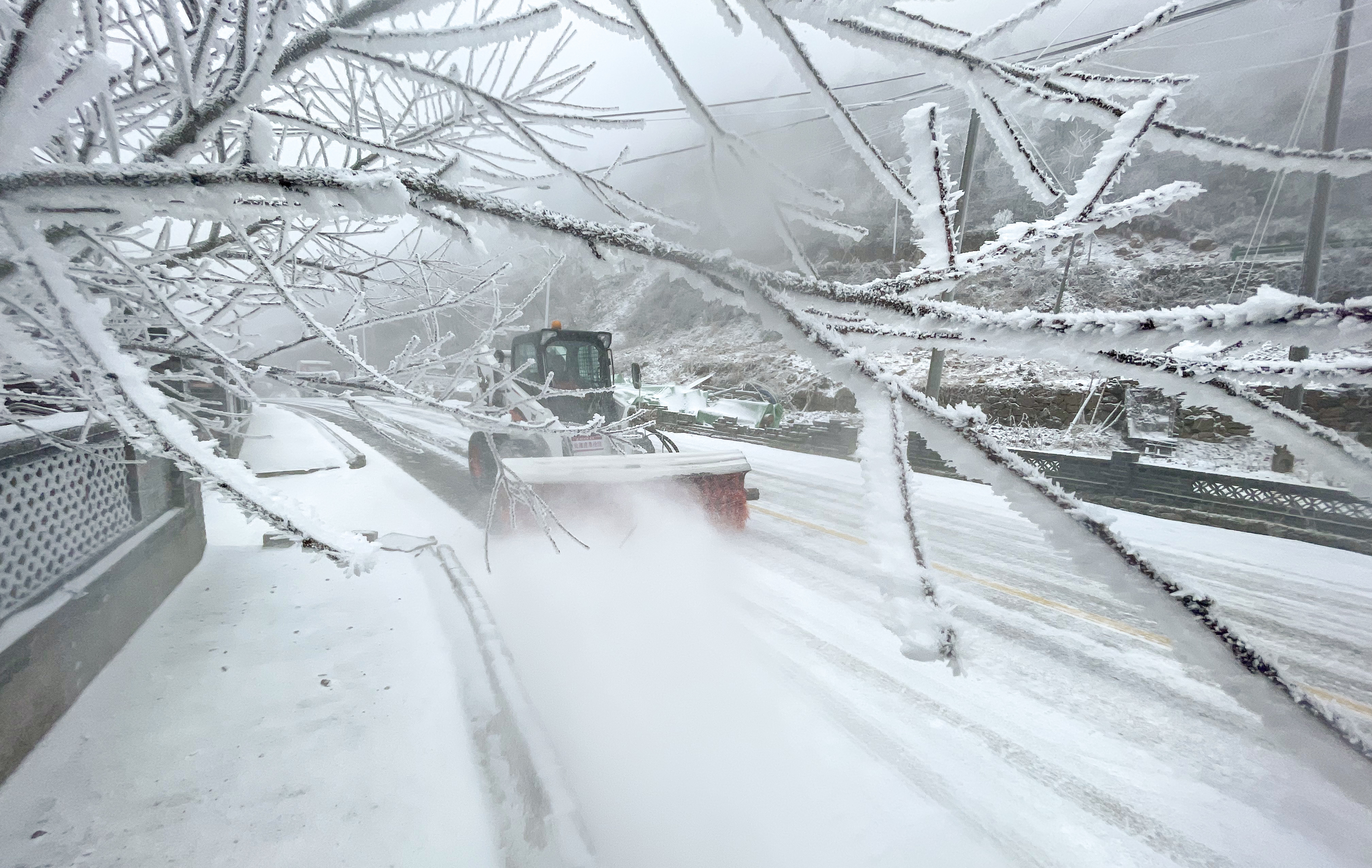 1月19日,在241国道湖北省保康县后坪镇红岩寺路段,公路养护工人在进行除雪作业。新华社发(陈泉霖摄)